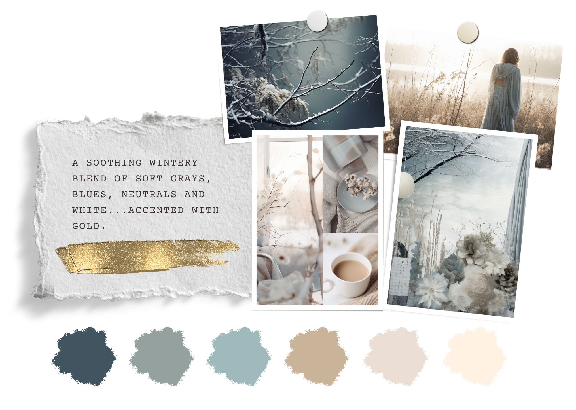 For our December theme, we're embracing the serene and contemplative essence of the winter season. This month, our palette is a homage to the hushed landscape of the colder months, featuring a spectrum of soft grays that recall the quiet of a winter's fog, the crisp blues of twilight on a frosty evening, an array of neutrals that bring to mind the bare branches against a snow-laden sky, and the pristine whites of freshly fallen snow. These hues capture the tranquil solitude of winter, reflecting the season's soft blankets of silence and the gentle whisper of snowflakes. Let's immerse ourselves in the calm and soothing symphony of these colors and discover the peaceful harmony they create together.