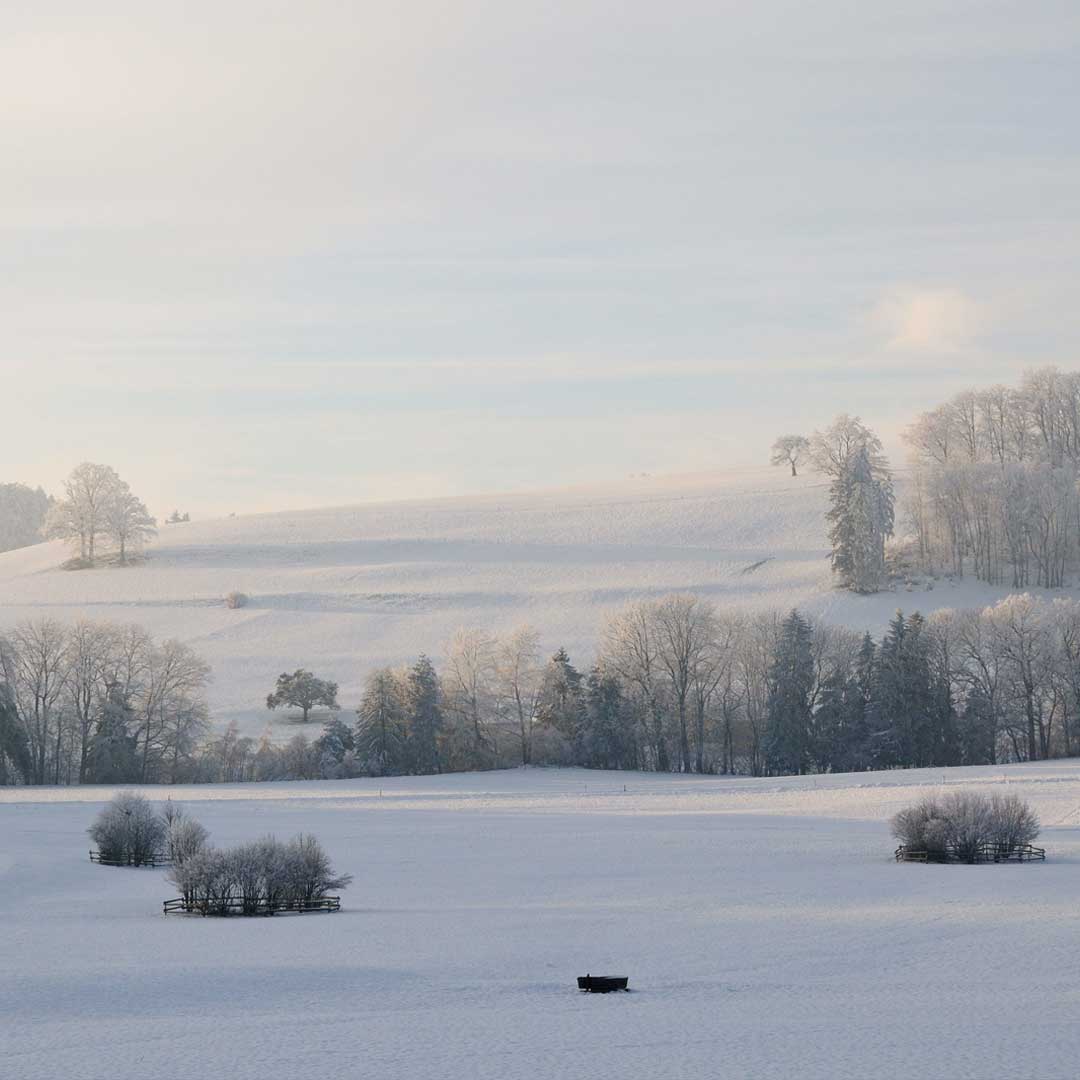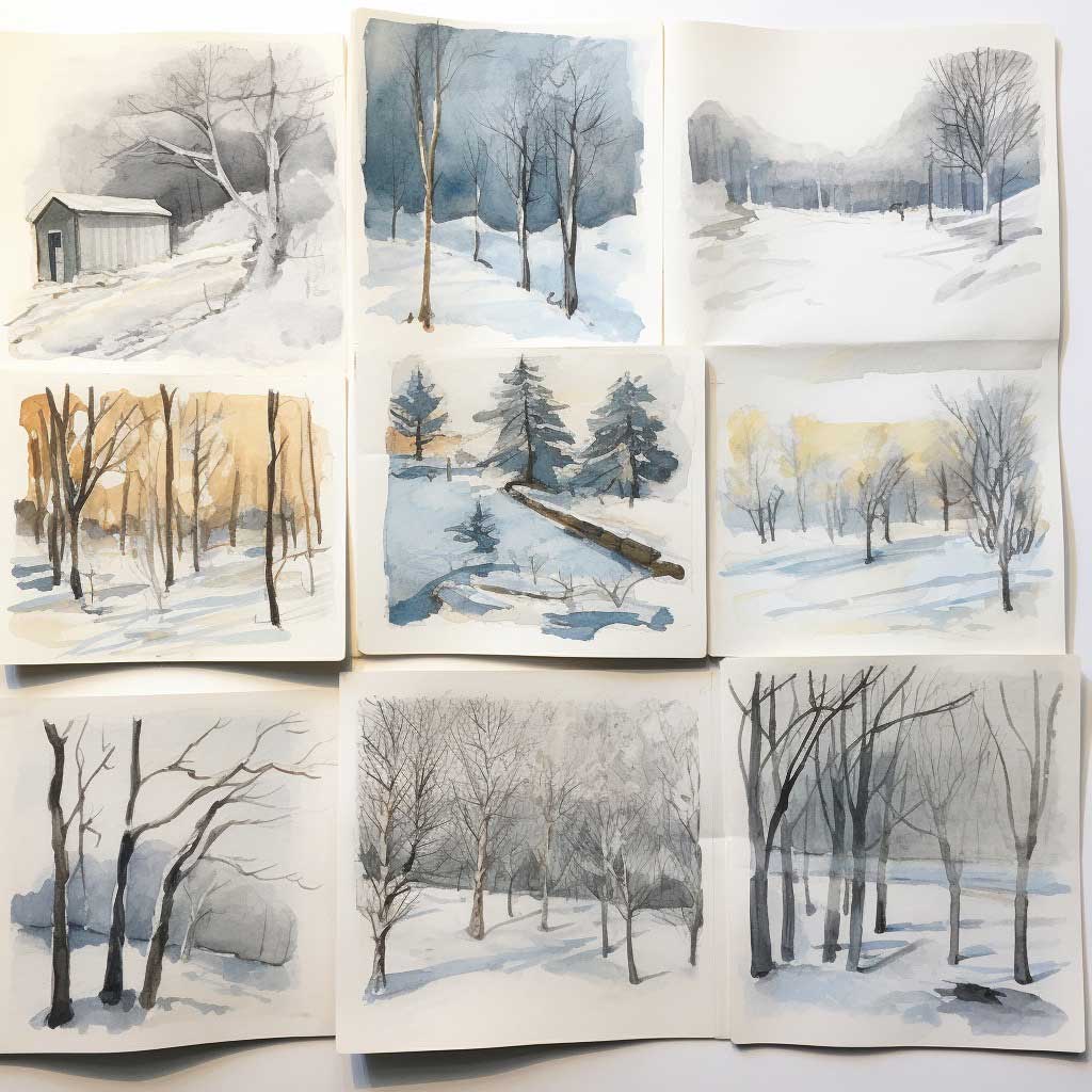 Create a series of color studies using a limited palette of whites, grays, blues, and earth tones. Experiment with how these colors can convey the mood of a winter landscape.
