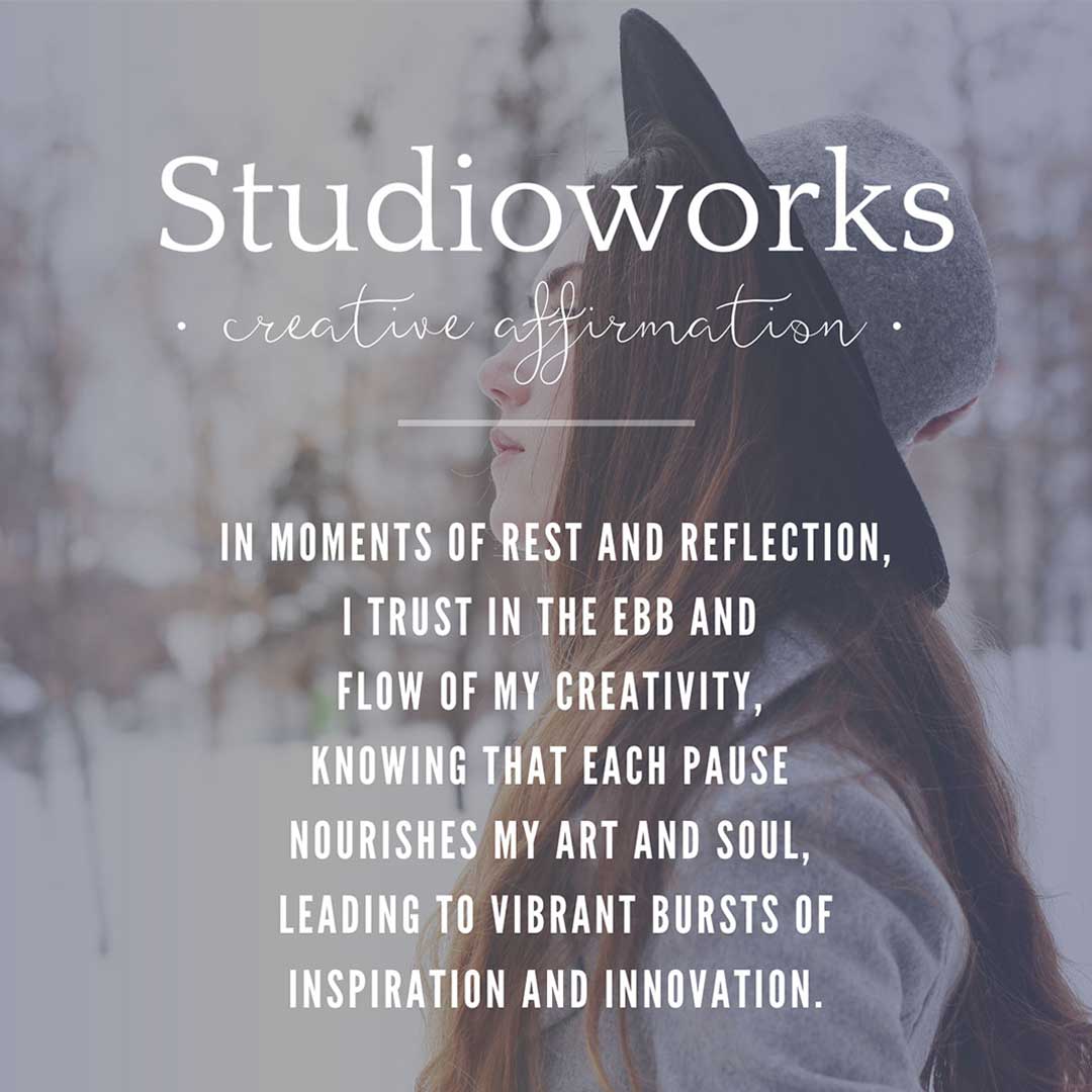 In addition, you will receive a monthly issue of the STUDIOWORKS JOURNAL. Here you’ll find articles, creative prompts, curated resources, downloadable artistic affirmations, sketchbook explorations, a full-length art lesson AND MORE!