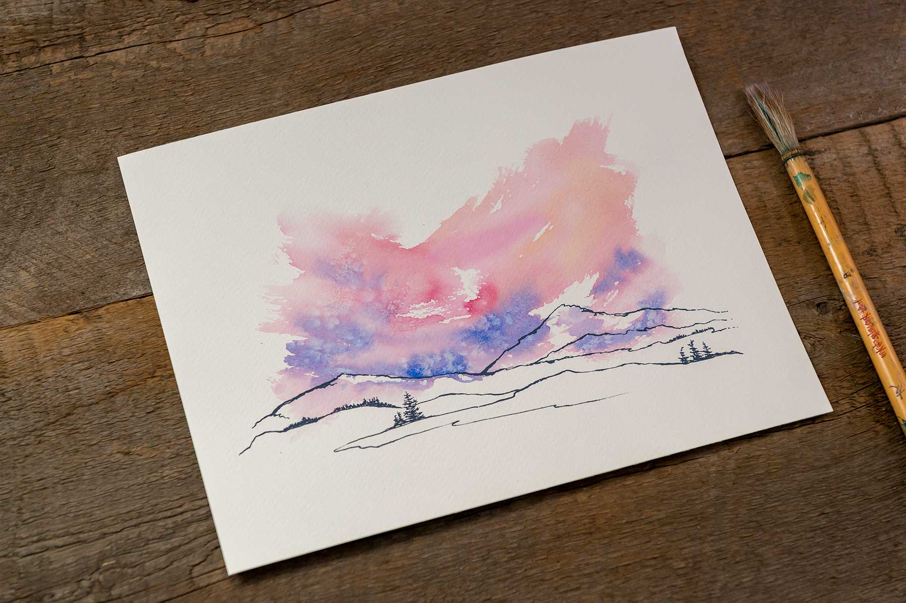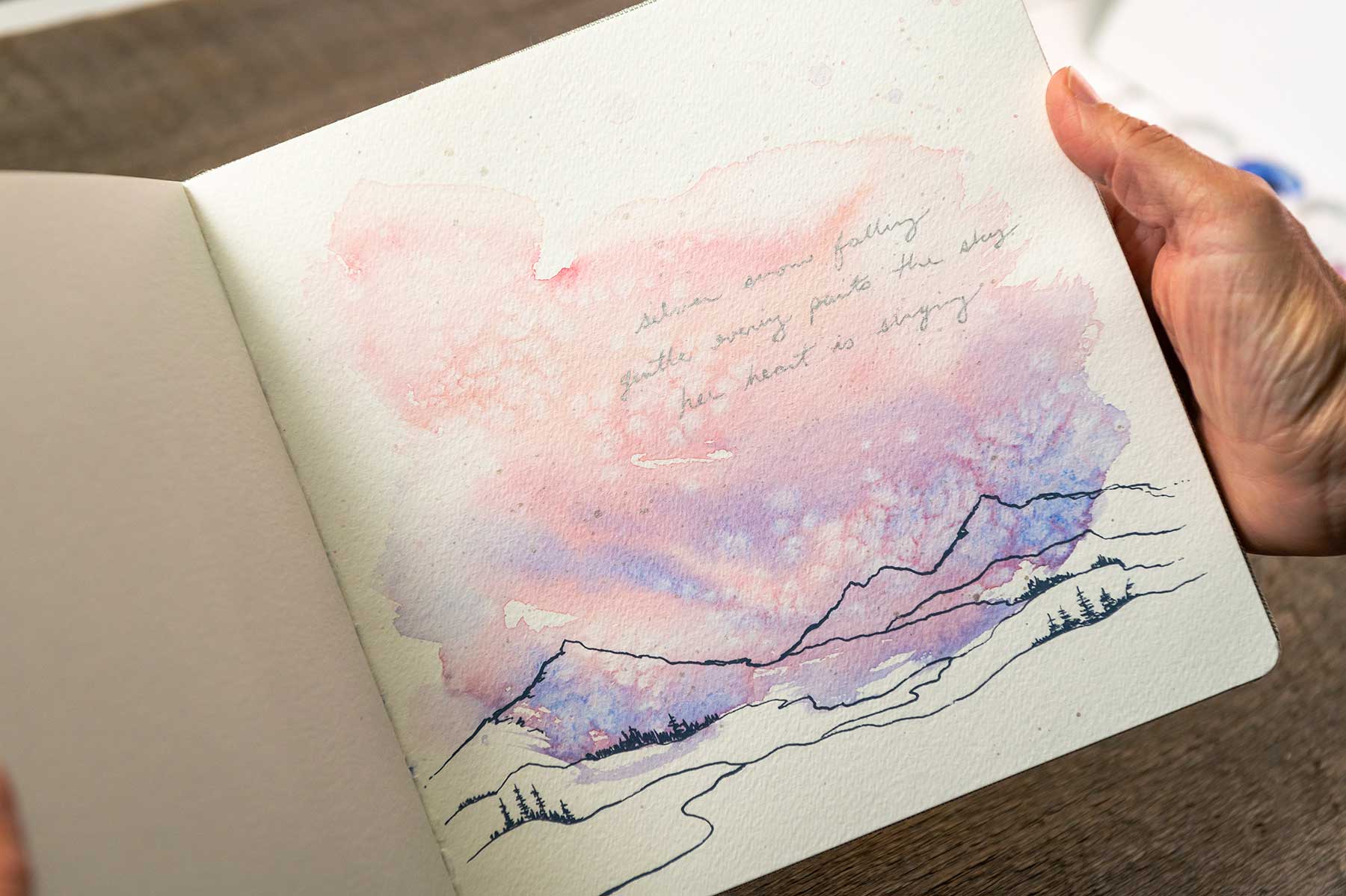 I also want to share with you how you to continue your watercolour exploration as an art journaling page. Working in my Handbook Journal Co. Watercolour Sketchbook, I use the same painting techniques, adding a sparkle of silver snow and a haiku that I wrote to express how I feel in the mountains.