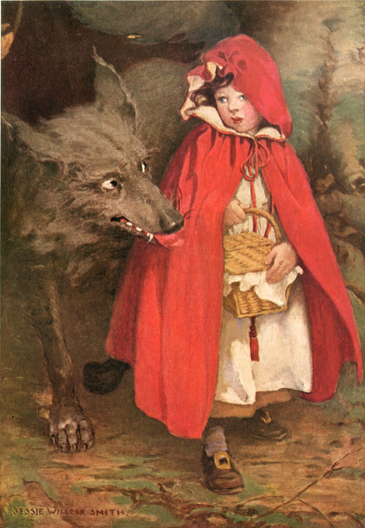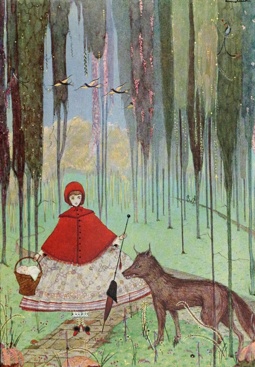 The visuals that populate book and movie adaptations of fairytales double-down their impact, often carving indelible images in the minds of viewers, young and old. The still of the witch handing Snow White a poisoned apple from Disney’s first animated film is a fine example.[4] Another is the eerily beautiful rendering of Little Red Riding Hood by Harry Clarke from a 1922 edition of The Fairy Tales of Charles Perrault.[5] In fact, the number of images conveying the girl in red and her wolfy adversary are among the most varied and ubiquitous, leaving few children without a vivid personal recollection.