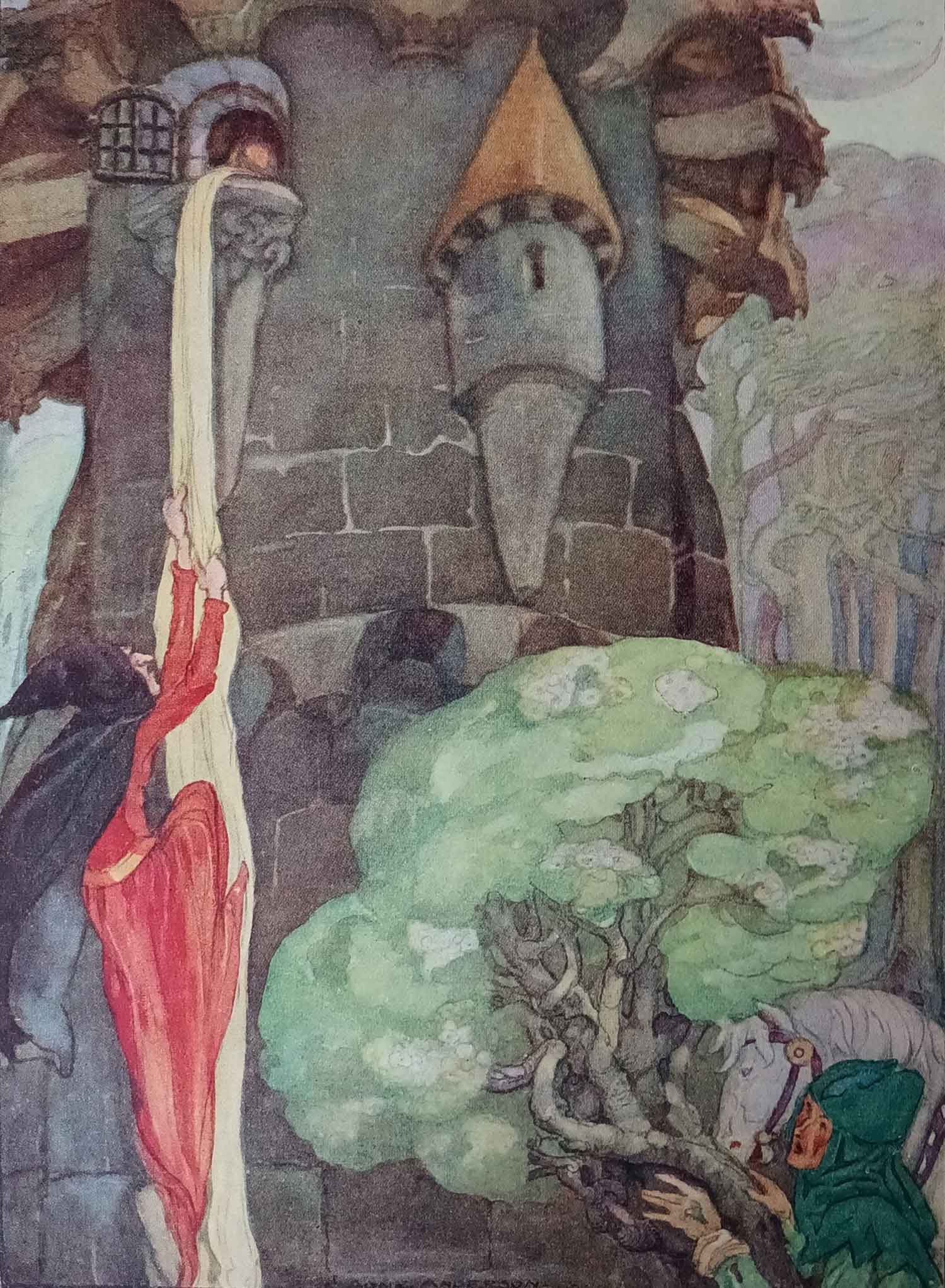 An example that beautifully captures some of the aforementioned elements, is an illustration of Rapunzel by Anne Anderson from a collection of Grimms Fairy Tales.[4] The maiden is obscured in the tower, you only glimpse her pure golden hair. The evil witch is sinister in color and form as she begins her ascent of the hair. Hidden behind a tree are the awestruck prince and his loyal steed. Rapunzel’s prison tower is dark and foreboding, but the surrounding landscape is soft with pastel hues of pink, green, and blue. The tension between good and evil is palpable in the scene.