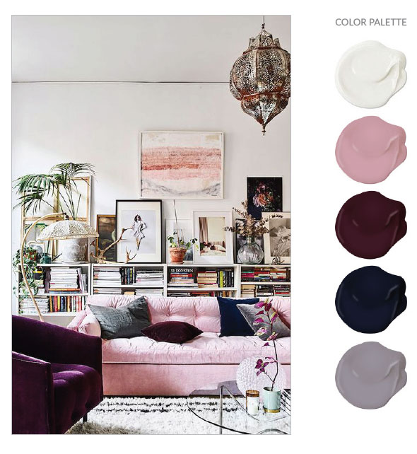 Here are some examples pulled from gorgeous interiors on Pinterest, I have created color palettes for each room that would work well in a painting.