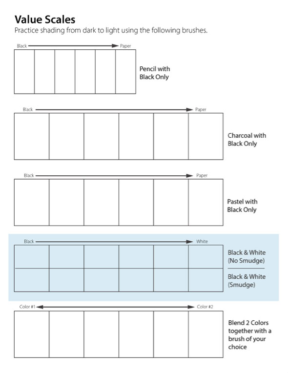 Practice shading from light to dark using a value scale. Download the Brush Qualities Worksheet and join me in the video to learn more.