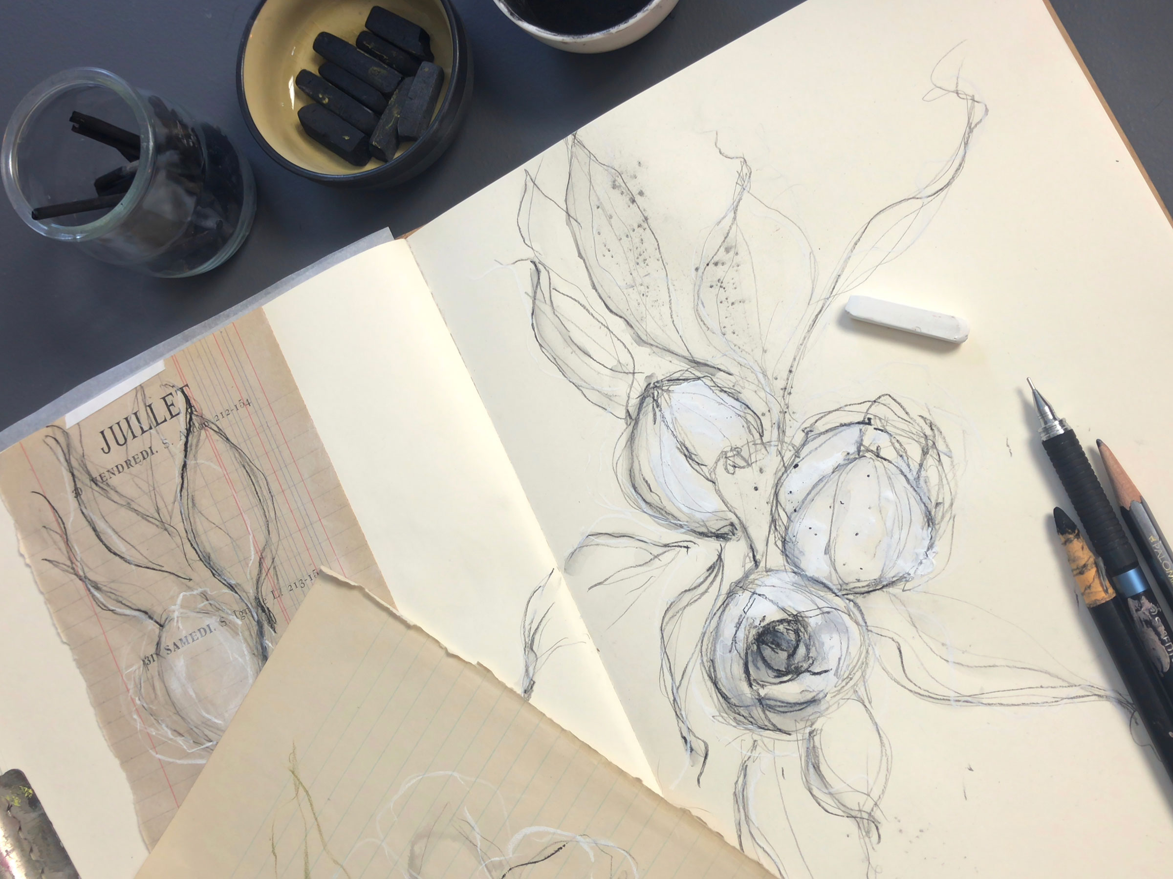 In addition, we will use newsprint and charcoal to continue to loosen up and create pages and pages of flowers to help to develop your vocabulary of mark making and explore value to give form to your drawings.