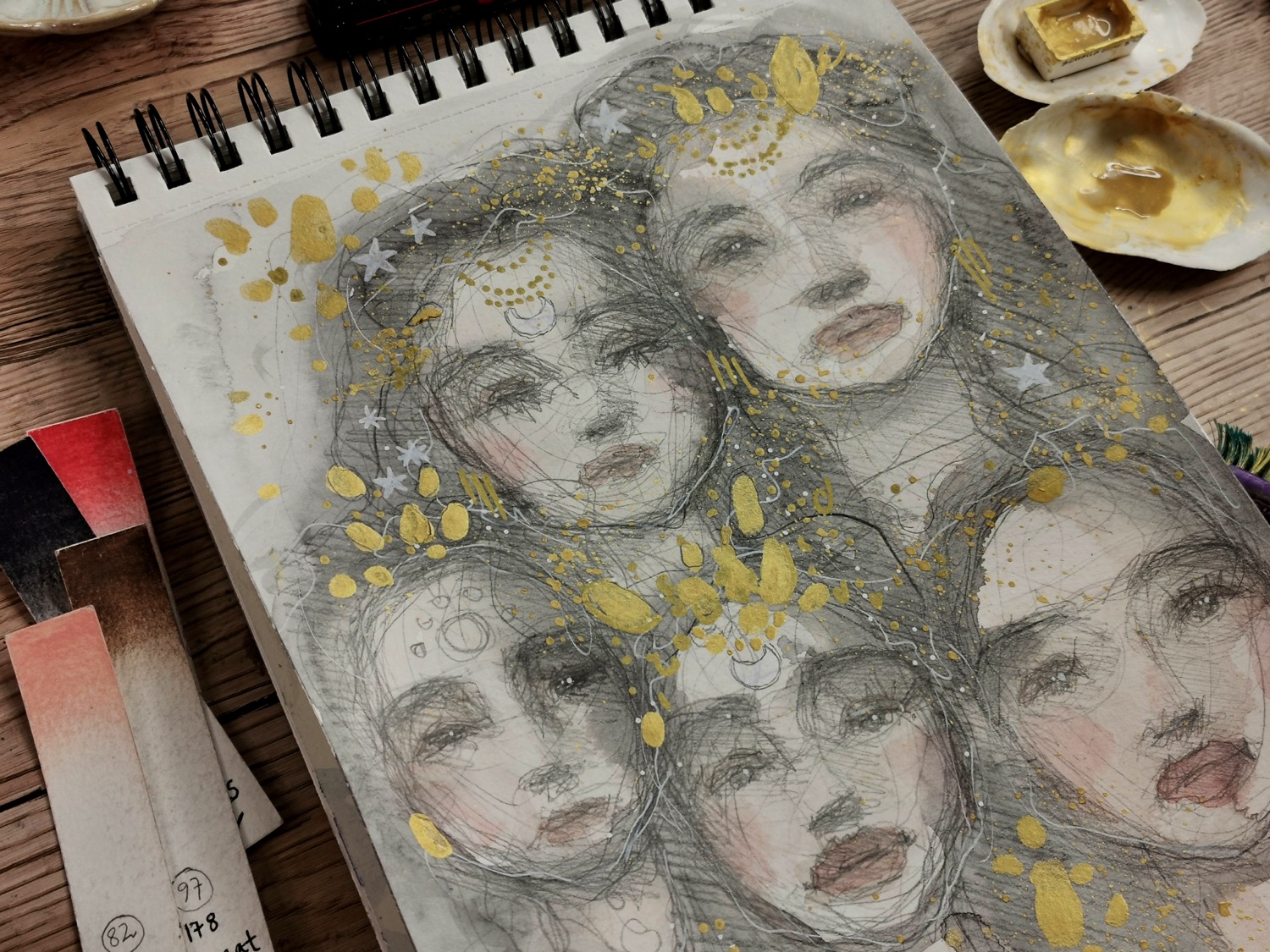 How to Open to Intuitive Portrait Drawing. Inspired by the timeless beauty and delicate essence of the human face, we begin our journey by exploring the intuitive process of drawing through a series of quick, croquis-style sketches. Using simple shapes as our guide, we will open up to the creative flow, allowing intuition to lead the way as we draw. We will start with graphite, and then add touches of watercolor and mixed media to bring our sketches to life.
