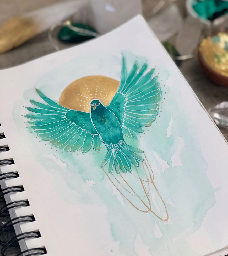So, it’s no coincidence that green (our beloved monthly color) is also associated with the heart chakra. And when you think of how deeply nurturing, fertile and bountiful the color green is, it makes perfect sense. Green is giving. Green is receiving. Green is abundant and rich and balanced. It has warmth and coolness. It literally symbolizes life itself. So for this exploration portray your green heart. This can be very abstract and expressive or more literal. You will see in mine, that I have expressed my green heart as a bird since this symbol has much meaning to me. Use any medium you like! Just have fun and embrace the joy of honoring your deep, green, beautiful heart.