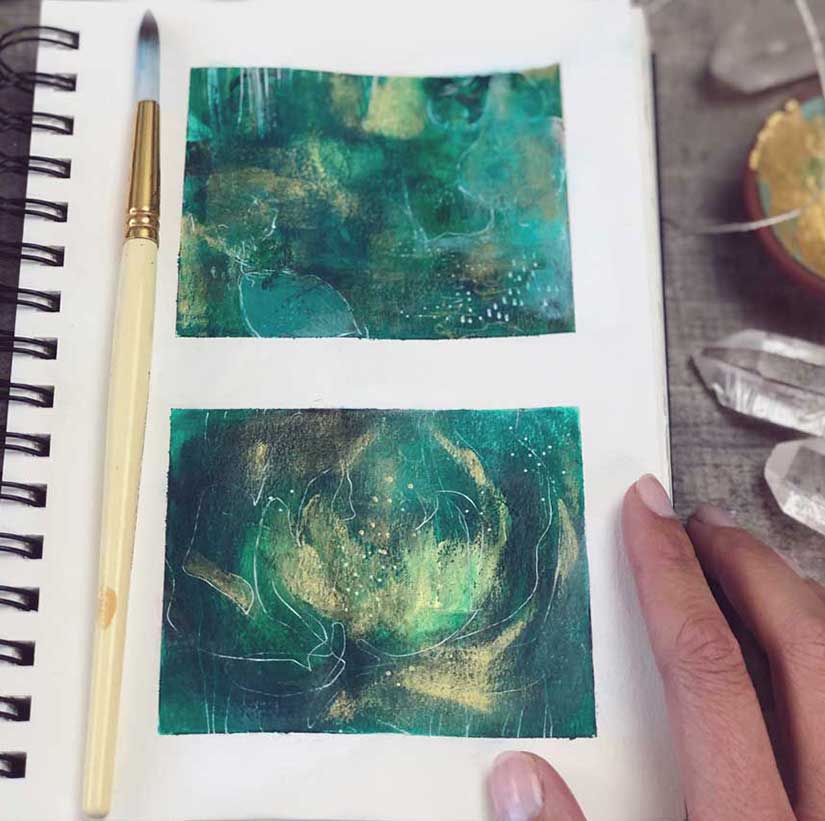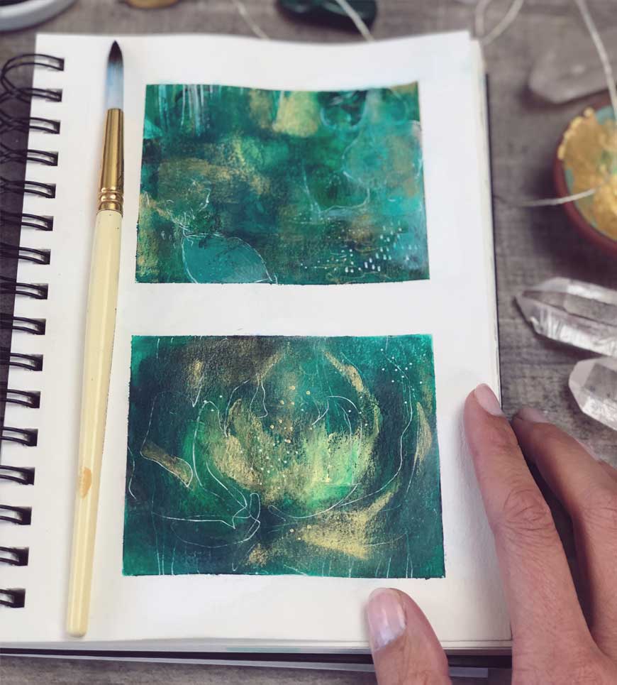 Create some small abstract explorations using emerald as your main inspiration color. Pair it with other colors you love. You can paint, collage or use whatever mediums call to you! Trust your intuition and play with different combinations and compositions. I literally sat for a few hours just layering paint and making marks, lost in the joy of simply exploring.