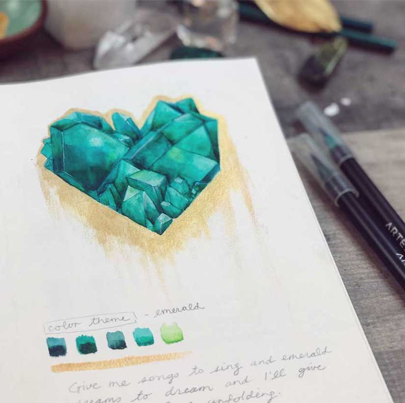 Our sketchbook theme this month is emerald green as you may have guessed. Explore this luxurious color and all the beautiful hues it can be paired with. I’ve made a little Pinterest board to inspire the use of this color! Let it be a representation of your inner joy, shining brightly with depth and infinite richness.