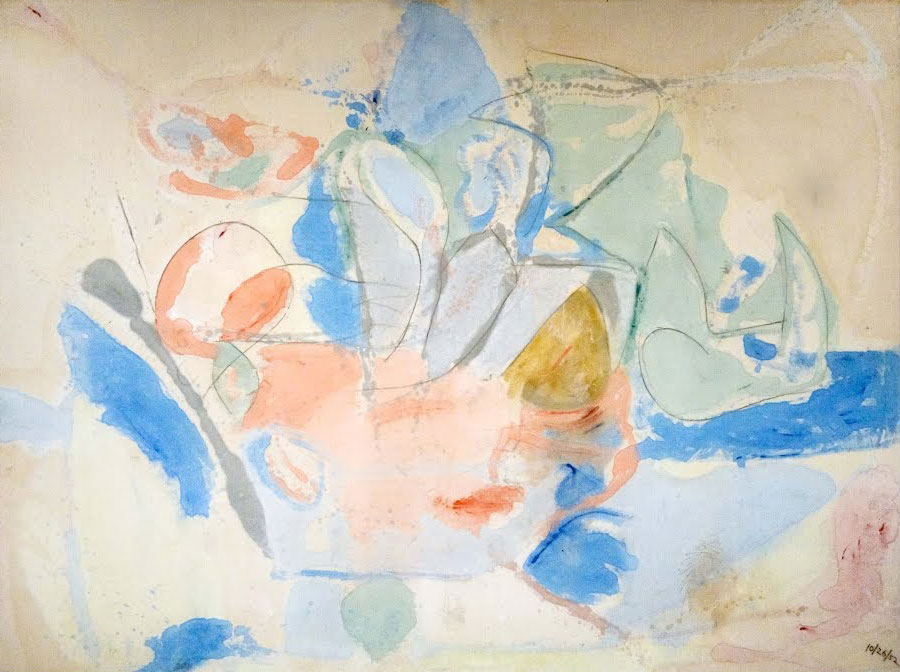 Frankenthaler’s professional exhibition career began in 1950, when Adolph Gottlieb selected her painting Beach (1950) for inclusion in the exhibition titled Fifteen Unknowns: Selected by Artists of the Kootz Gallery. Her first solo exhibition was presented in 1951, at New York’s Tibor de Nagy Gallery, and that year she was also included in the landmark exhibition 9th St. Exhibition of Paintings and Sculpture.