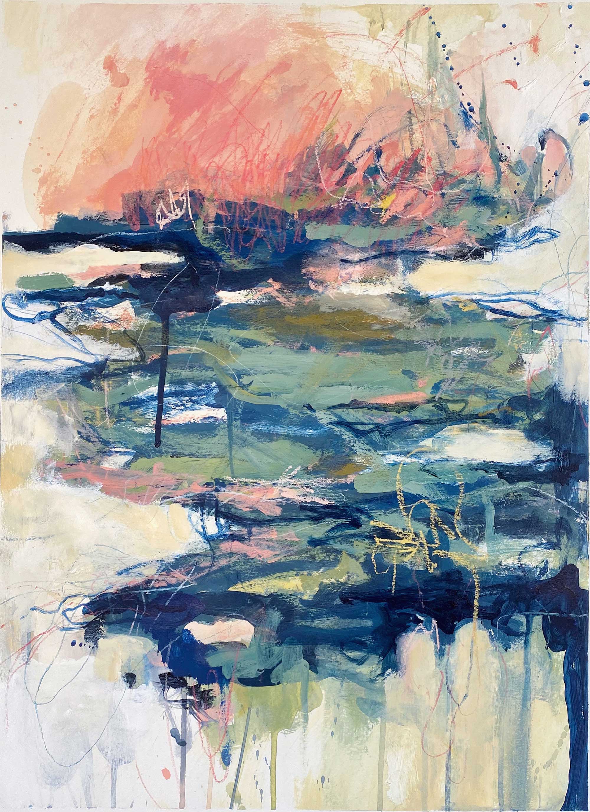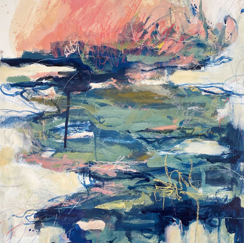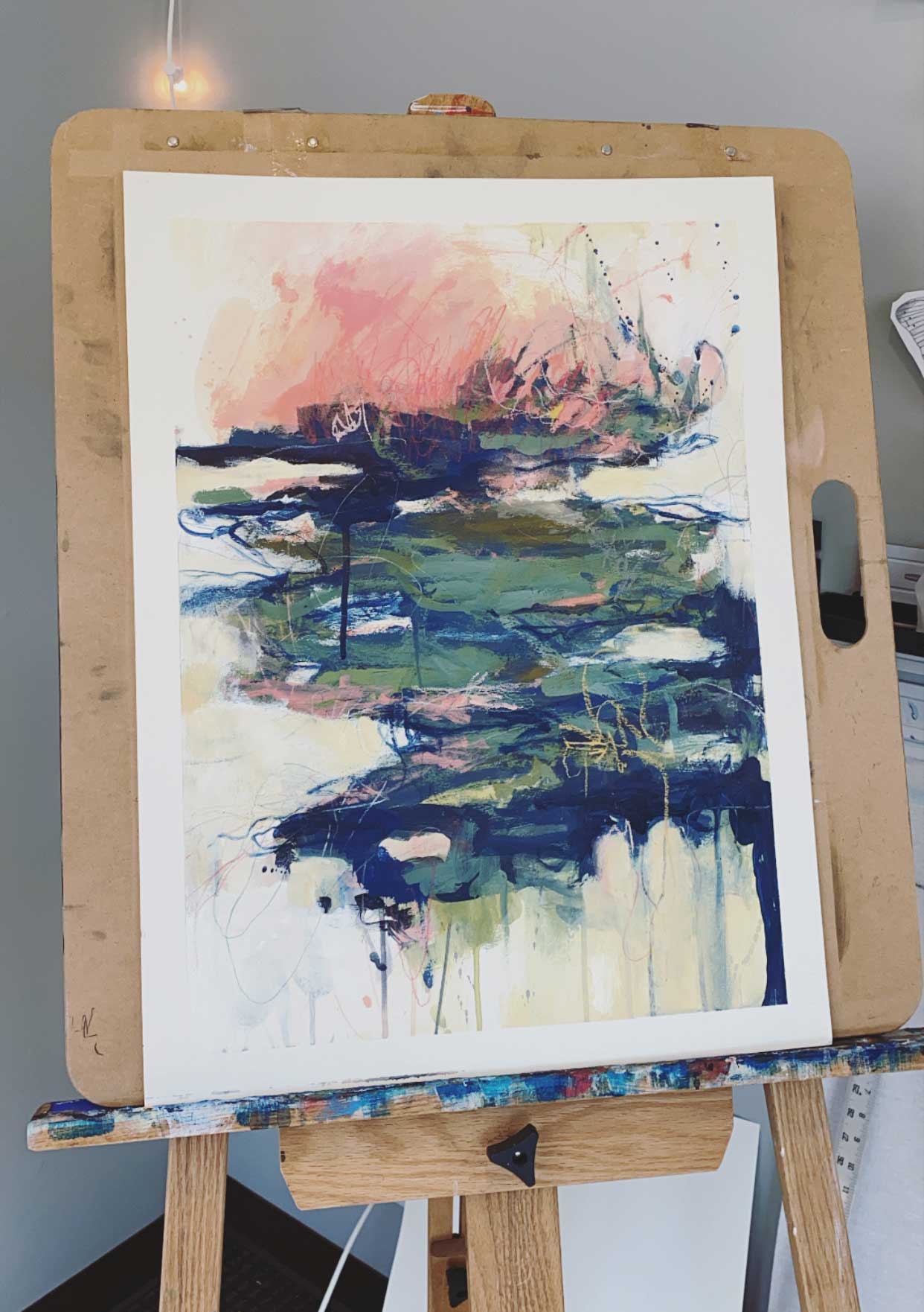 So with your abstract landscape in mind and the emotions and colors of this place, jump into this work with an open mind and heart. Let your inner child come out and play and simply enjoy the colors and textures of paint, pastel and paper.