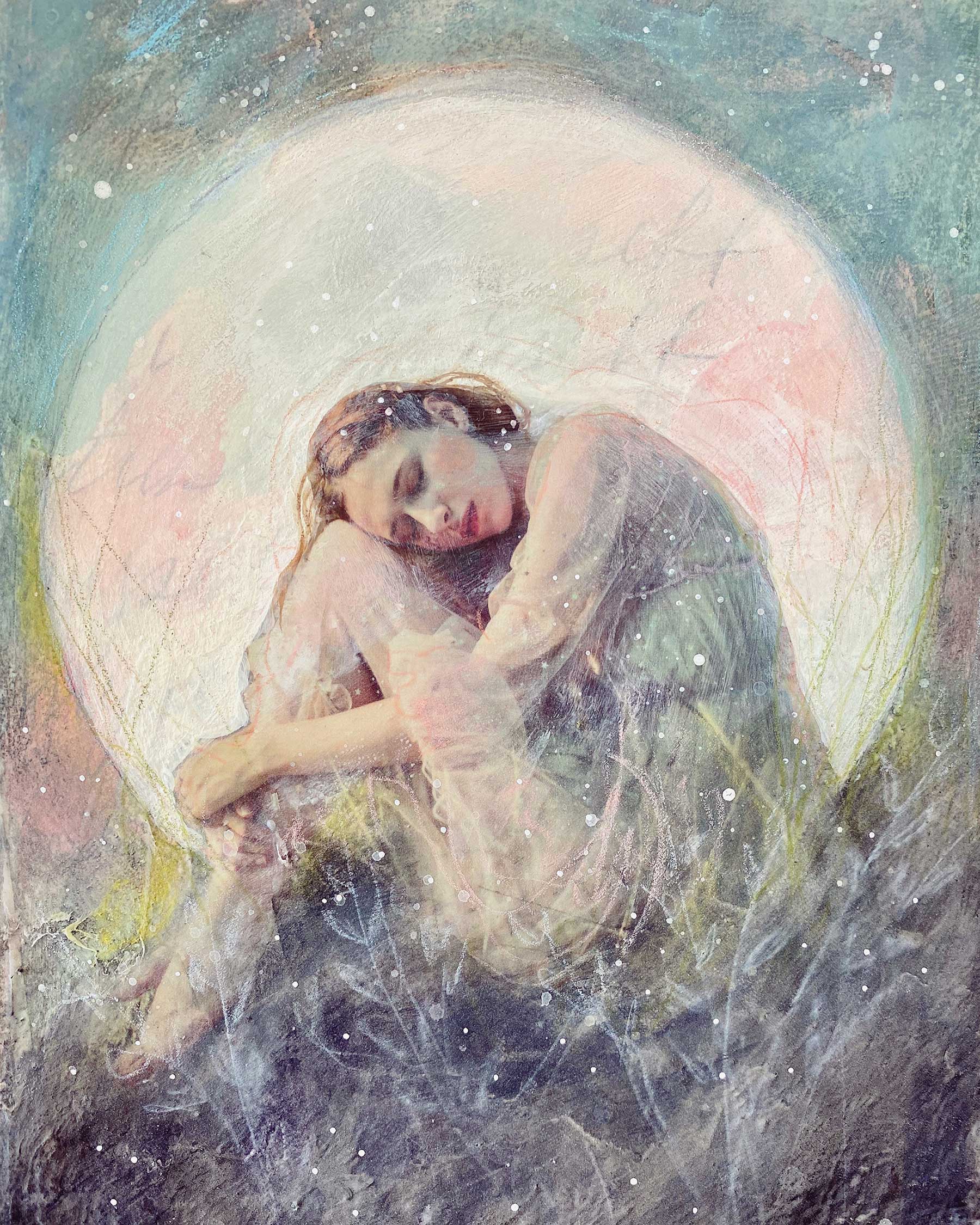 On a page in your sketchbook write over and over and over with a pencil – “I Trust Myself”. Now begin to add color, marks and layers on top….see what emerges from this exploration. I ended up collaging on a figure and really leaning into the emotional aspect of this exploration. You can use the same image here if you like…