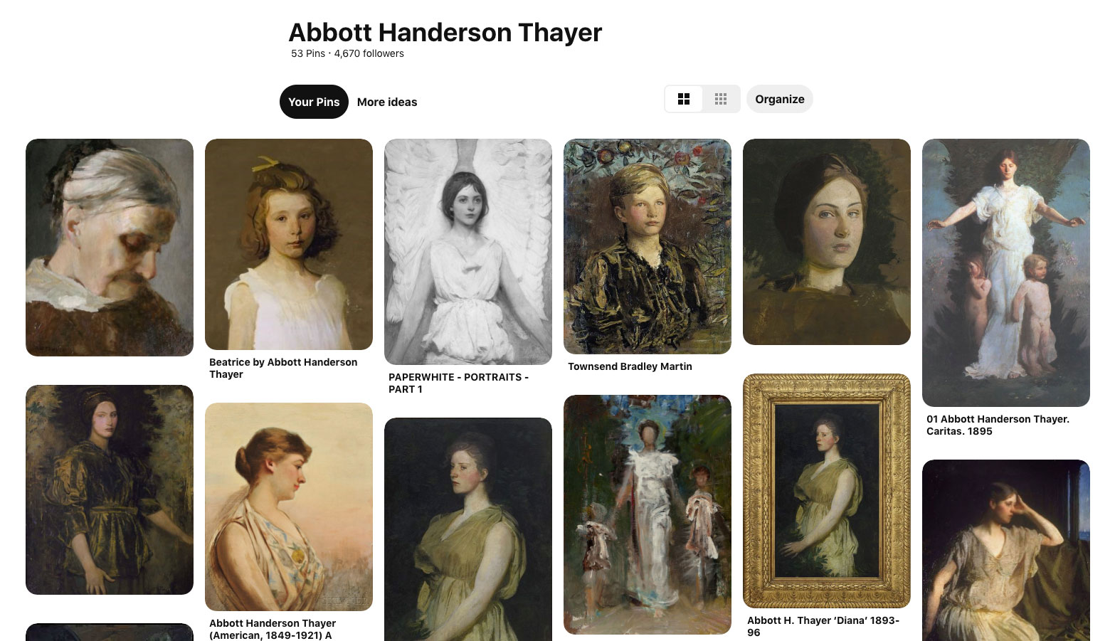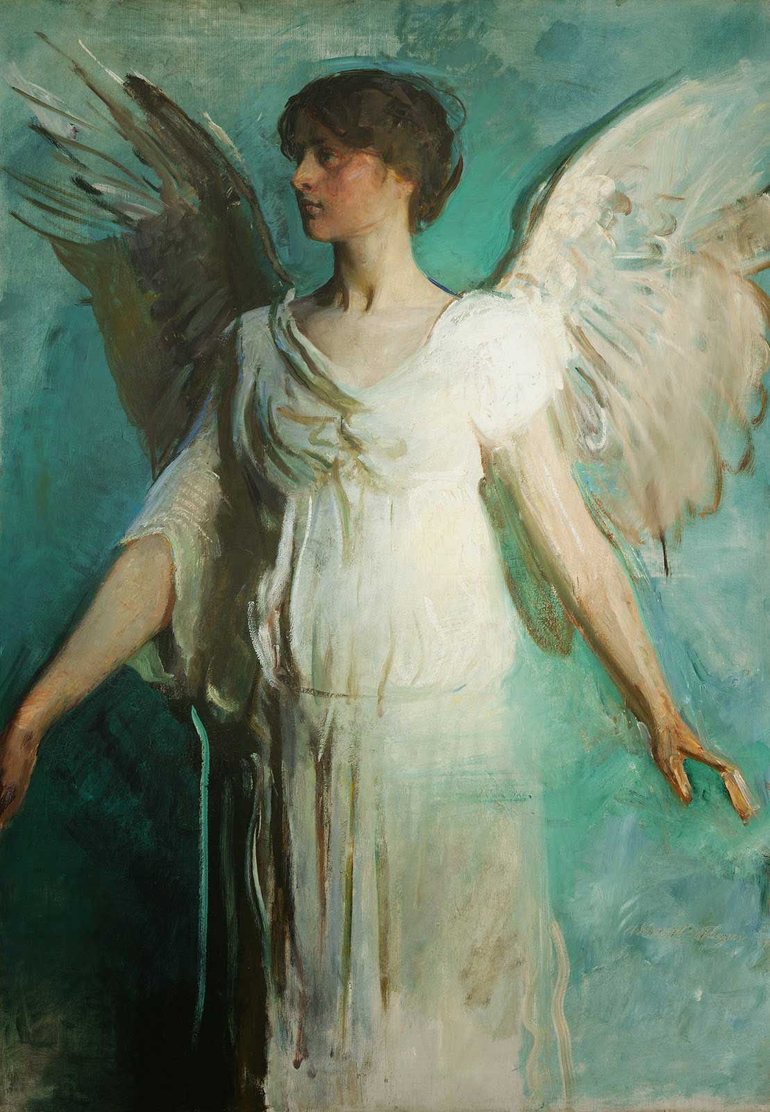 Thayer spent most of his life surrounded by women, whether they be in his household or models and he had a high regard for the divine virtue and aesthetic gifts of women. His portraits communicate this regard with quiet beauty and classic grace. In the 1880’s he began to add wings and halos to his female figures furthering this. His love of birds and all things winged only heightened these angelic works.
