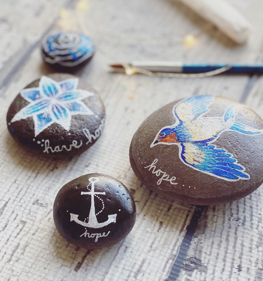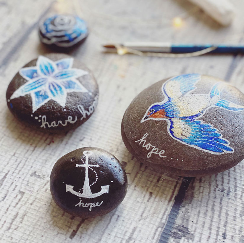 As we have discussed, art brings hope. So…let’s get out of our sketchbooks for a minute and spread some hope. Find a smooth stone (or several) in your garden or out and about and paint a symbol of hope on it – this can be a feather, a heart, an anchor, a bird, an angel or any other symbol that resonates with you. Now take your stones and place them out in your community for people to find. You could place them along hiking trails, in parks or public gardens or even on a bench. Maybe write a few words on the back. Leaving these little tokens of hope may just make the difference in someone’s day. If you have children in your life, get them involved too!