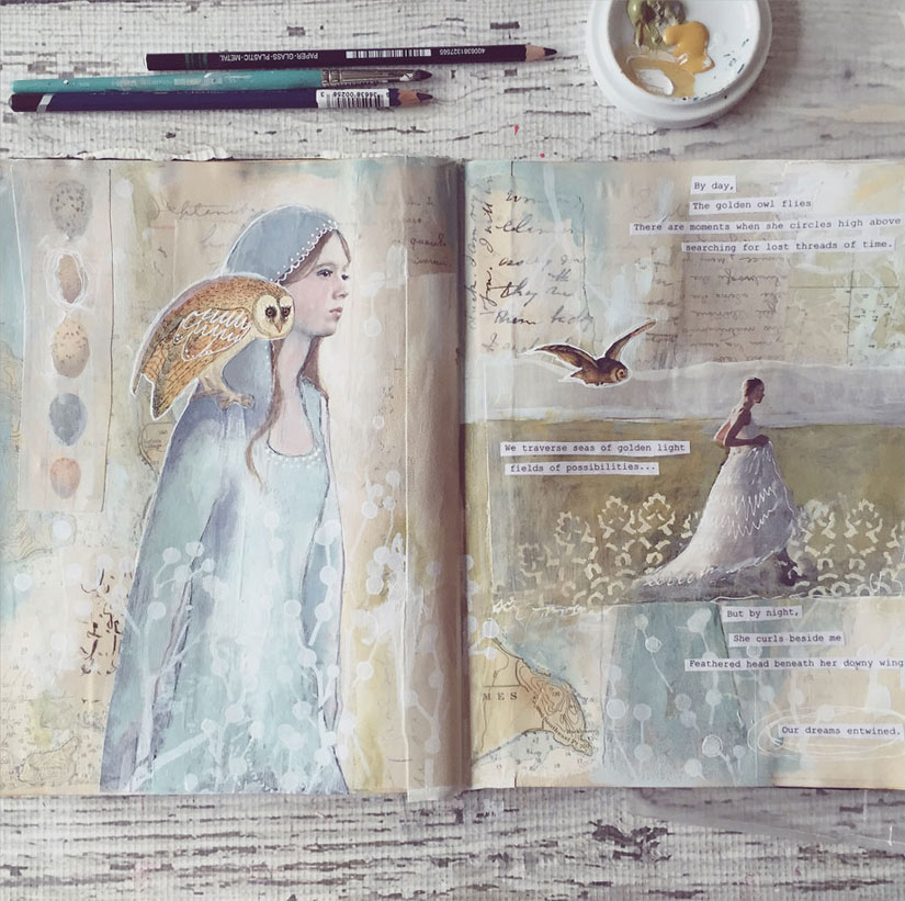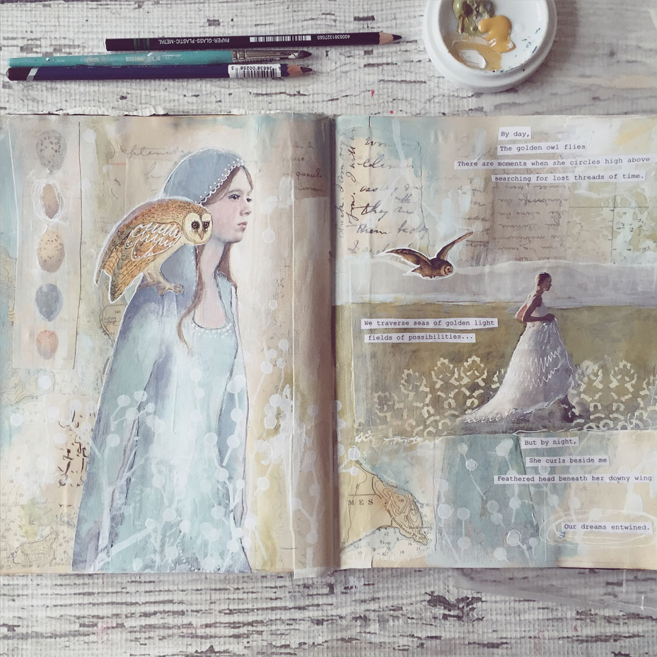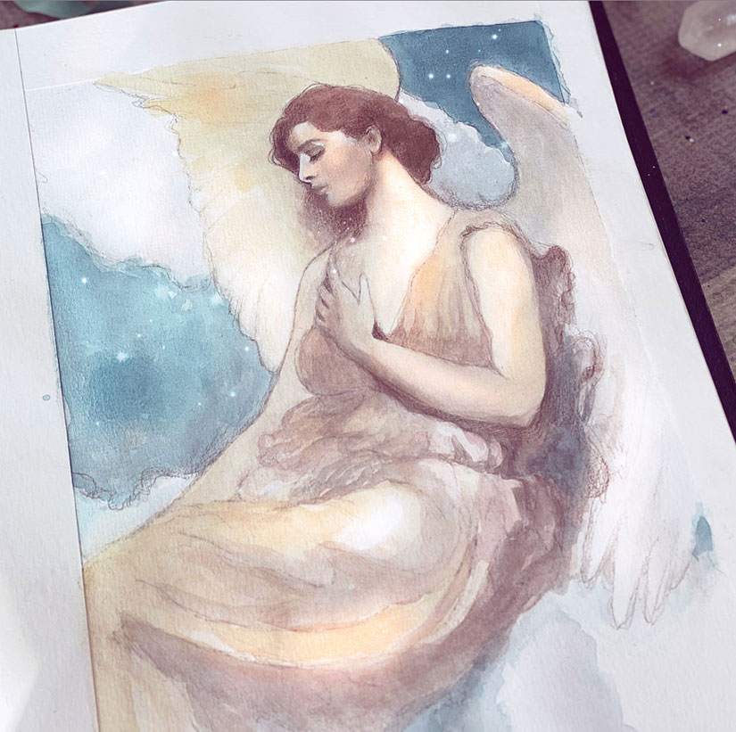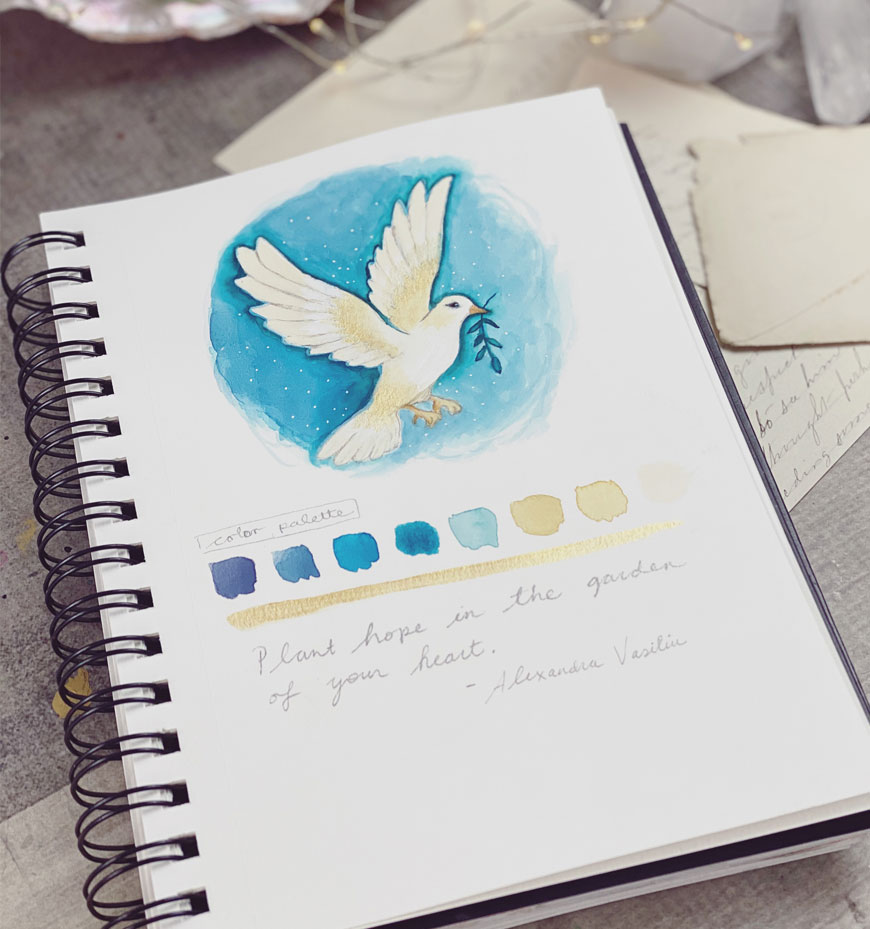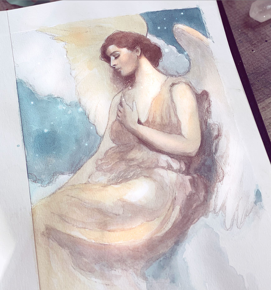 Our sketchbook theme this month is Angels, birds and symbols of hope. Since we are focusing on hope, it only makes sense that we work with the realm of angels. Angels, for so many represent hope, guidance, faith and reassurance. Angelic figures are pervasive across the globe and seen in many cultures and belief systems. The common thread is that these light beings are connected to divinity and act as protectors and messengers of hope. They are wonderful to create with so I hope you will enjoy this aspect of our explorations this month.