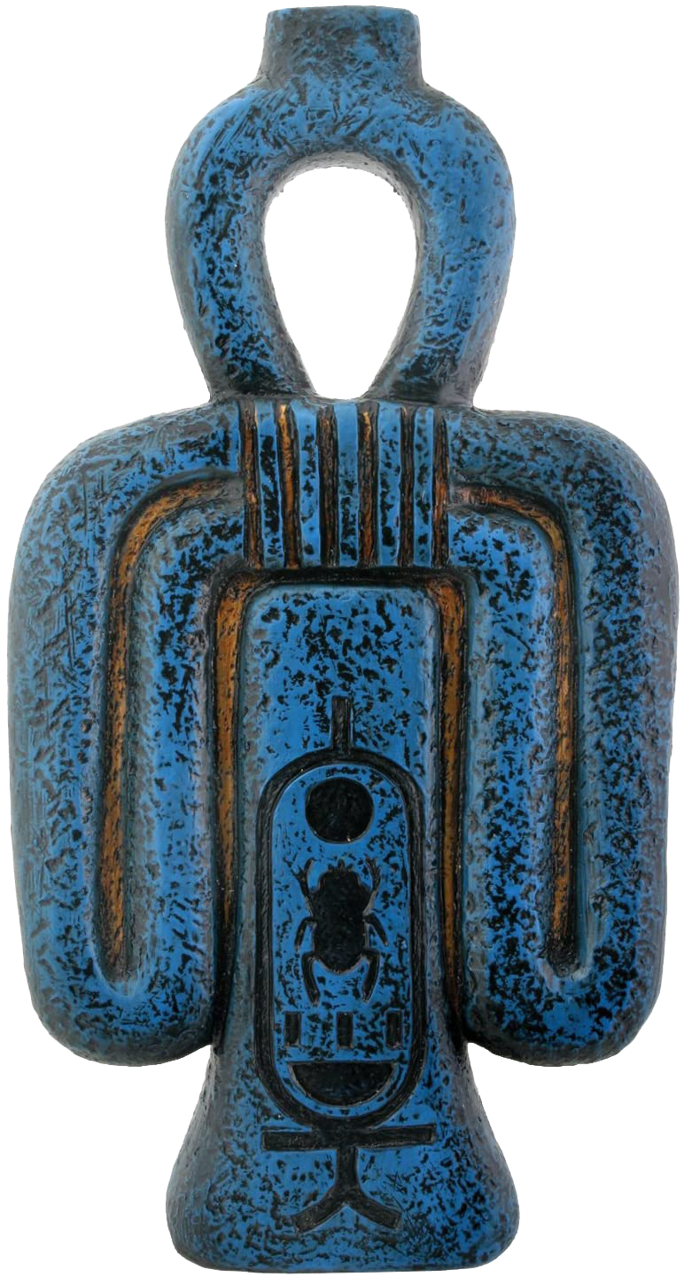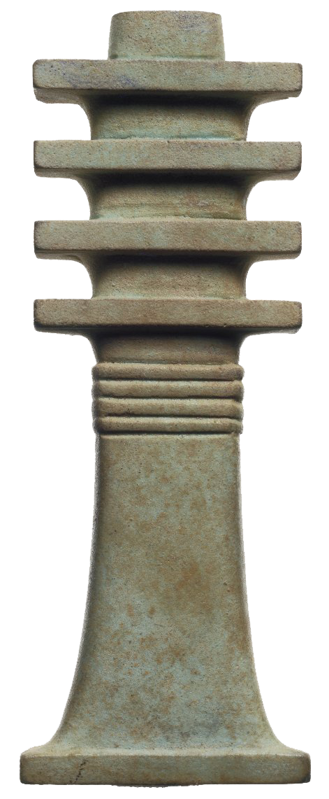 The djed is a column with a broad base narrowing as it rises to a capital and crossed by four parallel lines. Representing stability, the symbol served to remind one of the close presence of the gods. The djed was thought to represent the god’s backbone and frequently appears on the bottom of sarcophagi to help the newly arrived soul stand up and walk into the afterlife.