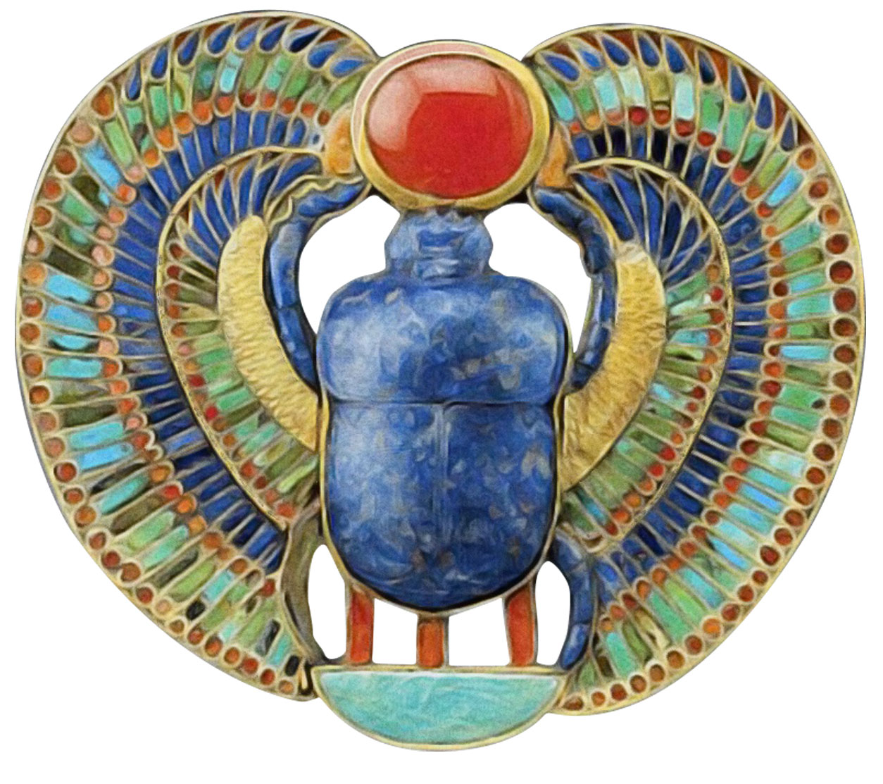 The scarab is the famous beetle image seen in Egyptian art and iconography which represents a species of the dung beetle. The dung beetle was associated with the gods because it rolled dung into a ball in which it laid its eggs; the dung served as food for the young when they hatched. In this way, life came from death.
