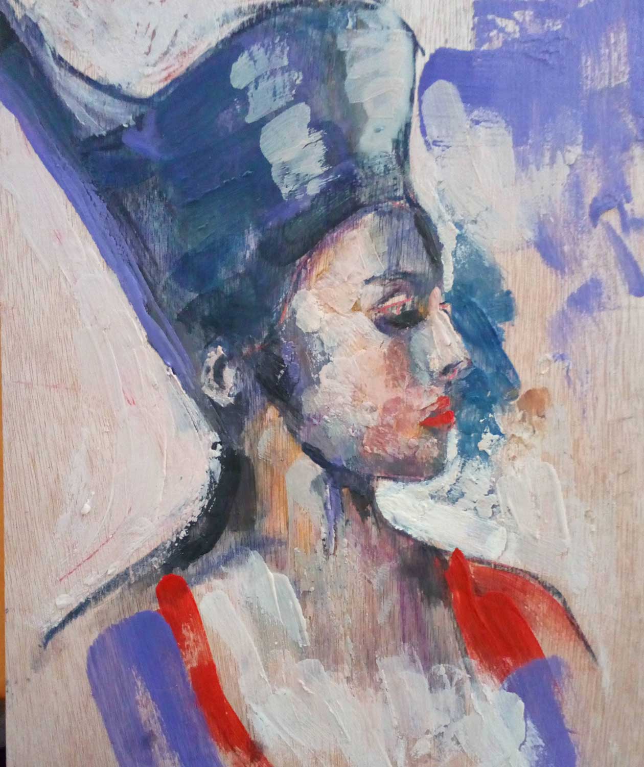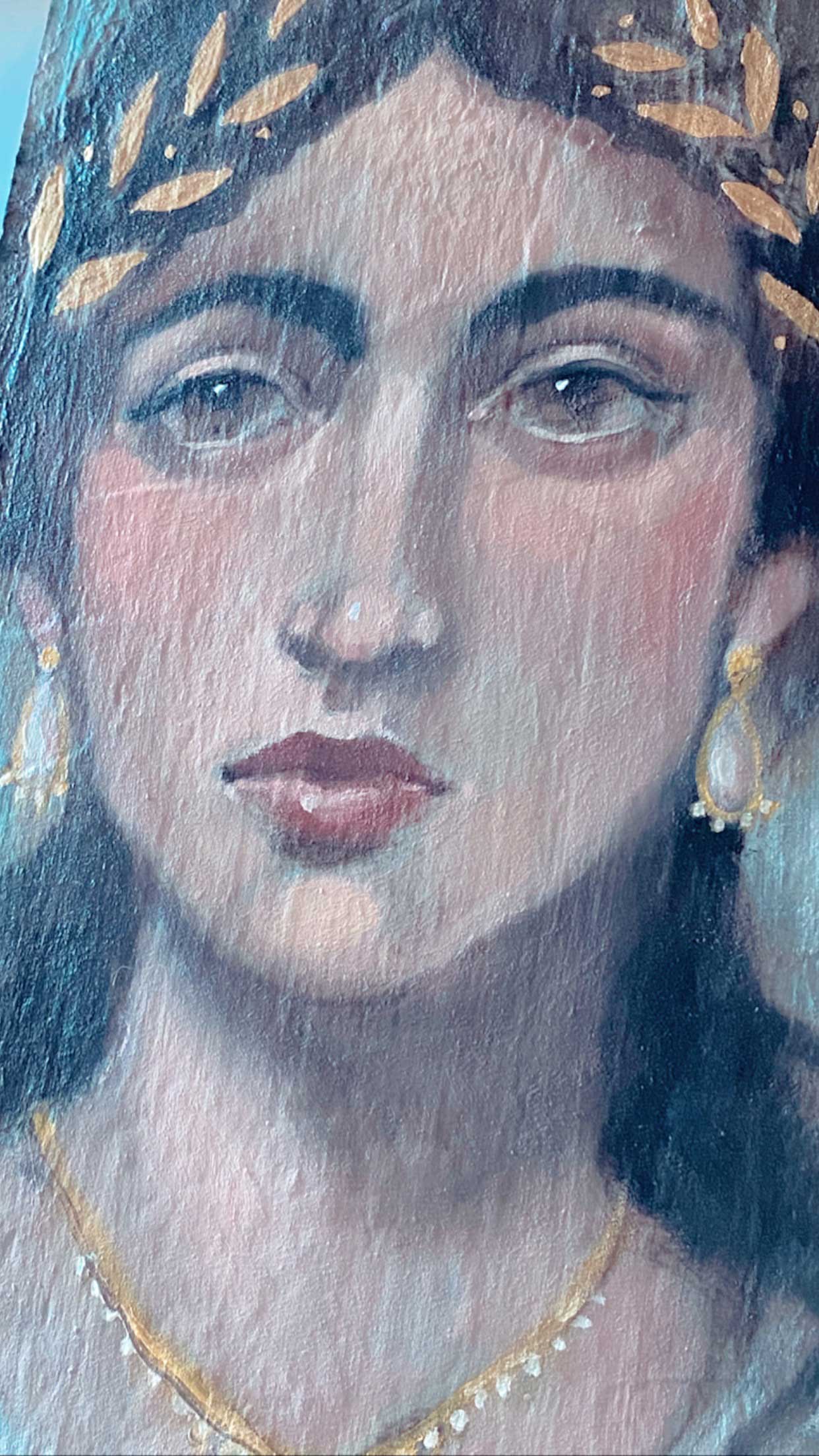 I laid down a gray blue tone as my background. I noticed this color in some of the Fayum pieces. You could choose any color. If your light blue mix is looking too bright, dull it down with Raw Umber or a touch of orange.