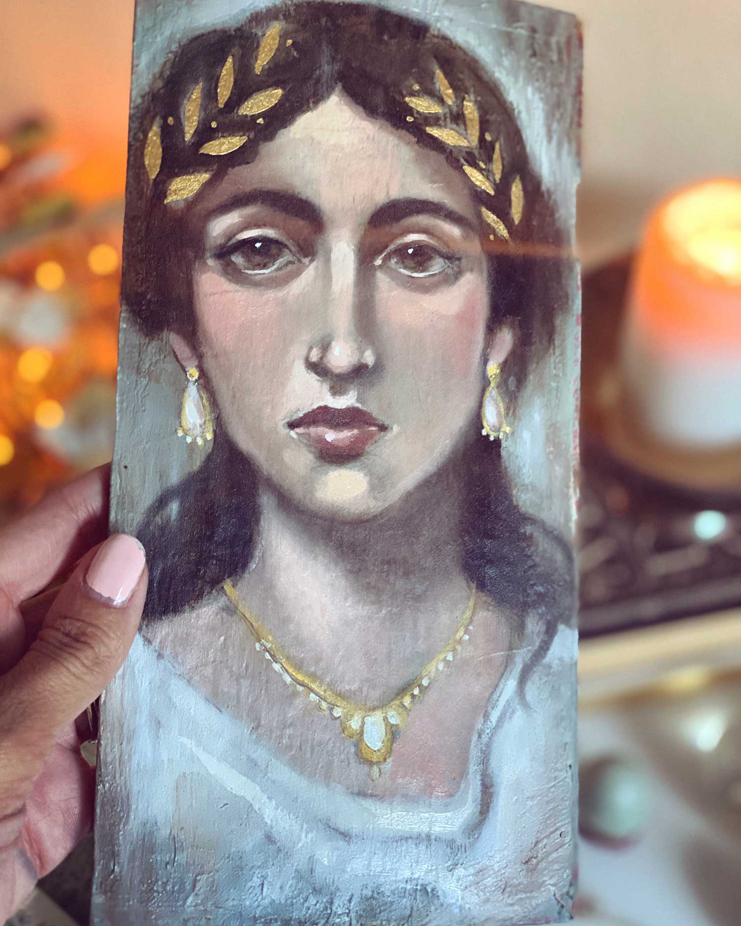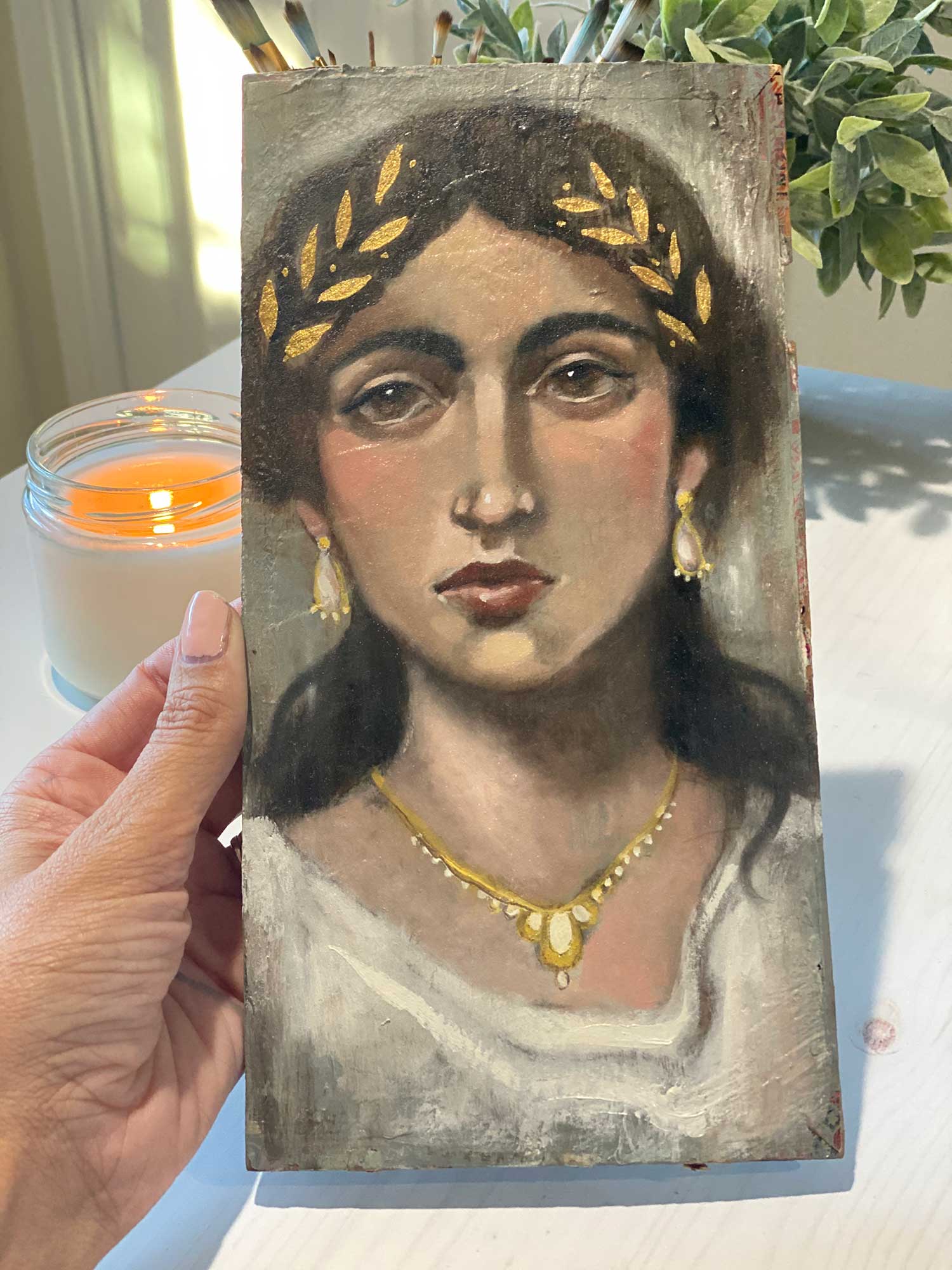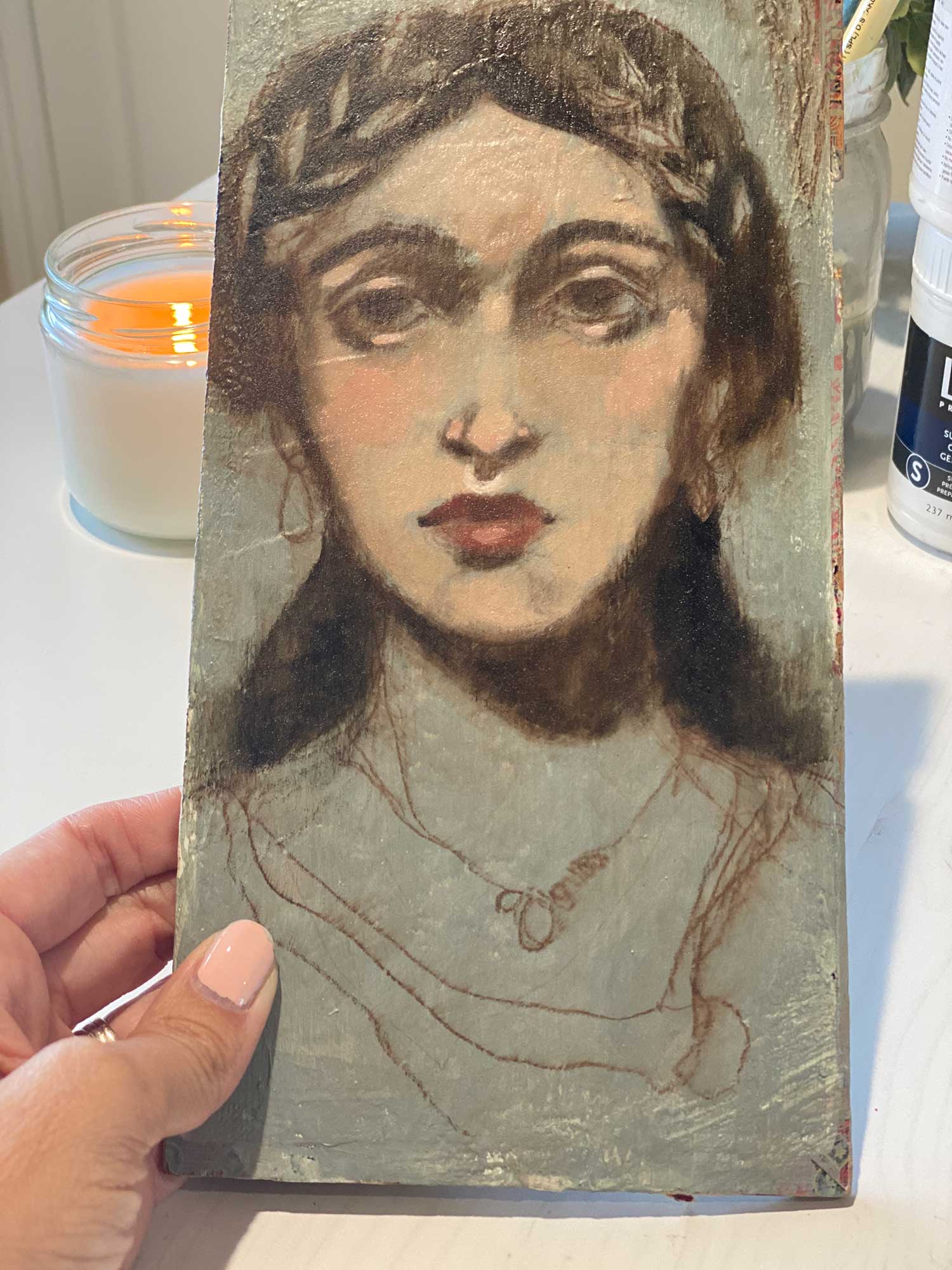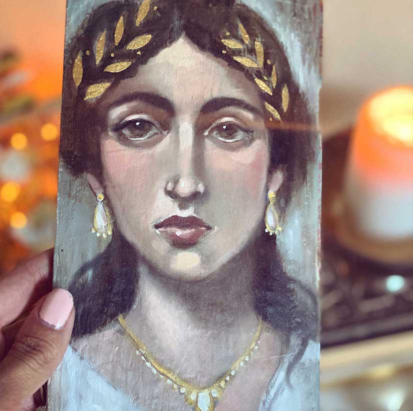 I made my Fayum Mummy Portrait using an old wooden cigar box lid. I liked the long vertical shape that is similar to the Mummy portrait format. You could also use a wood panel, or a very rigid piece of cardboard or canvas board. You can find old wooden cigar boxes at antiques shops and on Etsy. I also found these great boards on Amazon that are the same size as the lid I used! I’m ordering some because I want to do more!