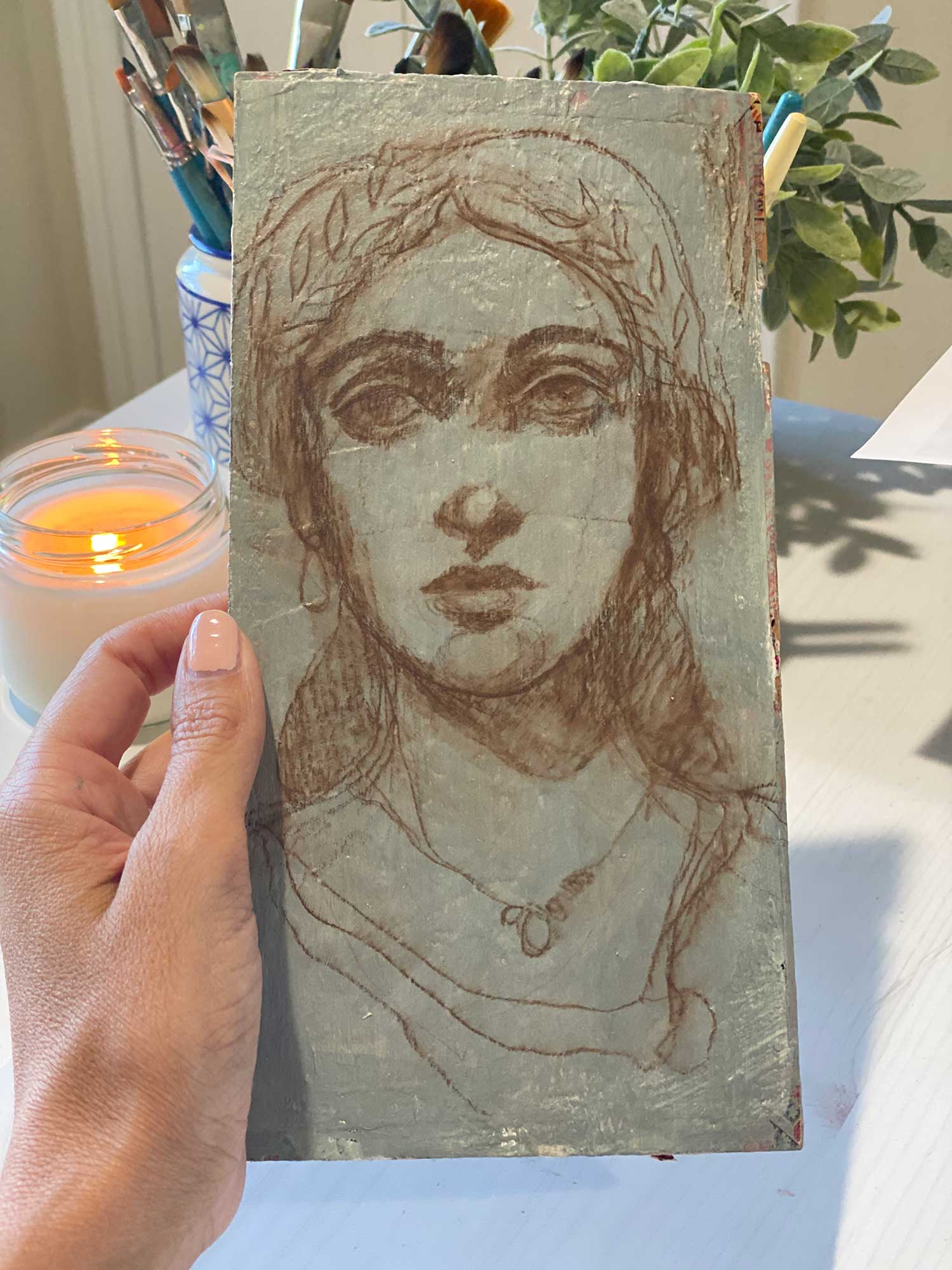 Do a sketch of your Fayum portrait using a reference or from your imagination. Remember they often had large eyes and simple faces so don’t worry about doing photo realism here. I used a Stabilo All Pencil in brown to do my sketch. You could also use a charcoal pencil.