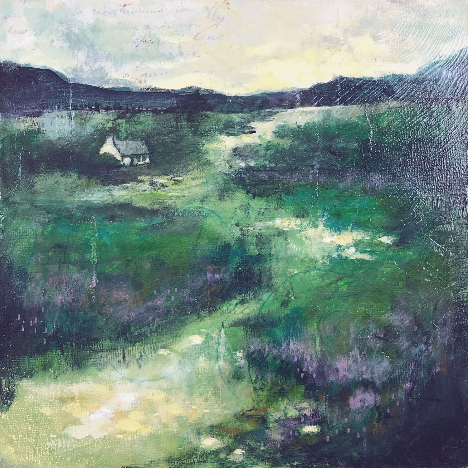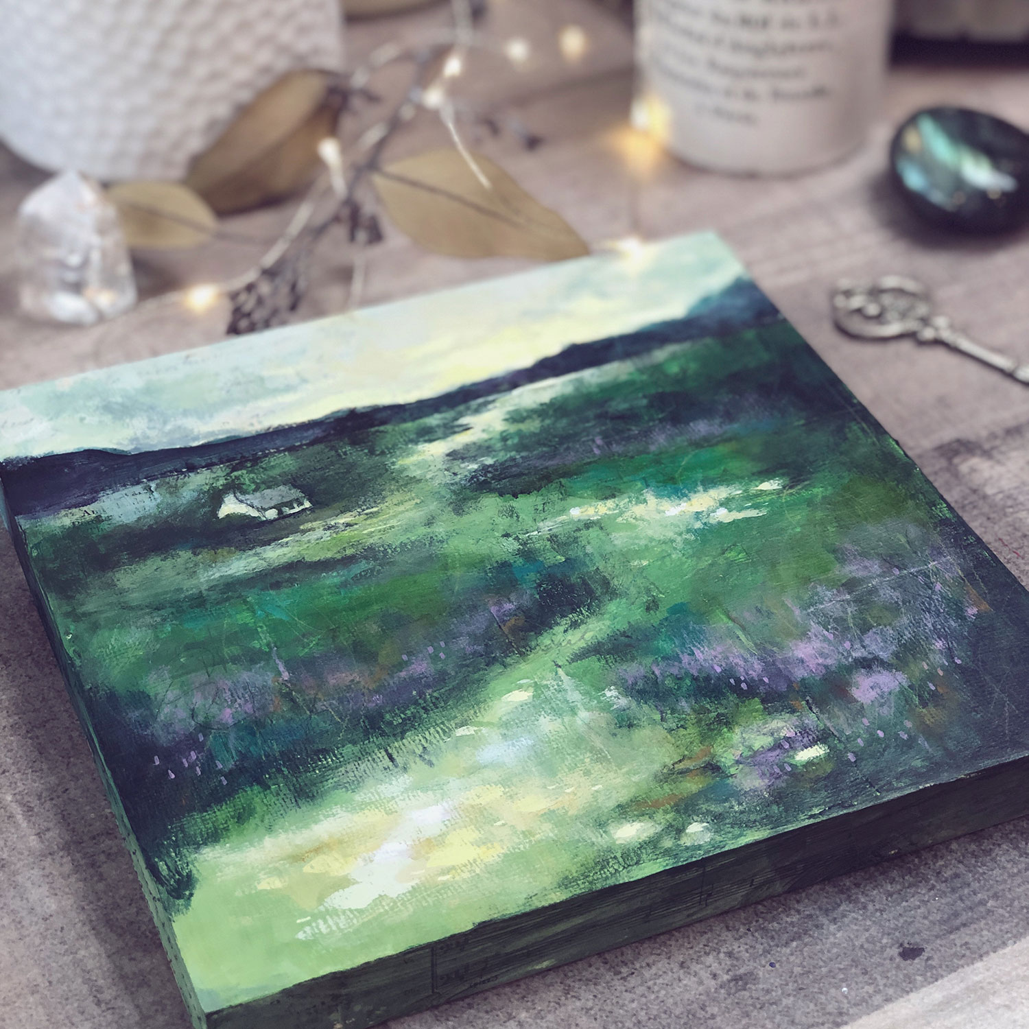 Oh this one was a delight to create! What began as a somewhat abstract landscape unfolded into a tranquil and magical scene complete with my sweet dream stone cottage, nestled among the emerald green of Ireland’s landscape.