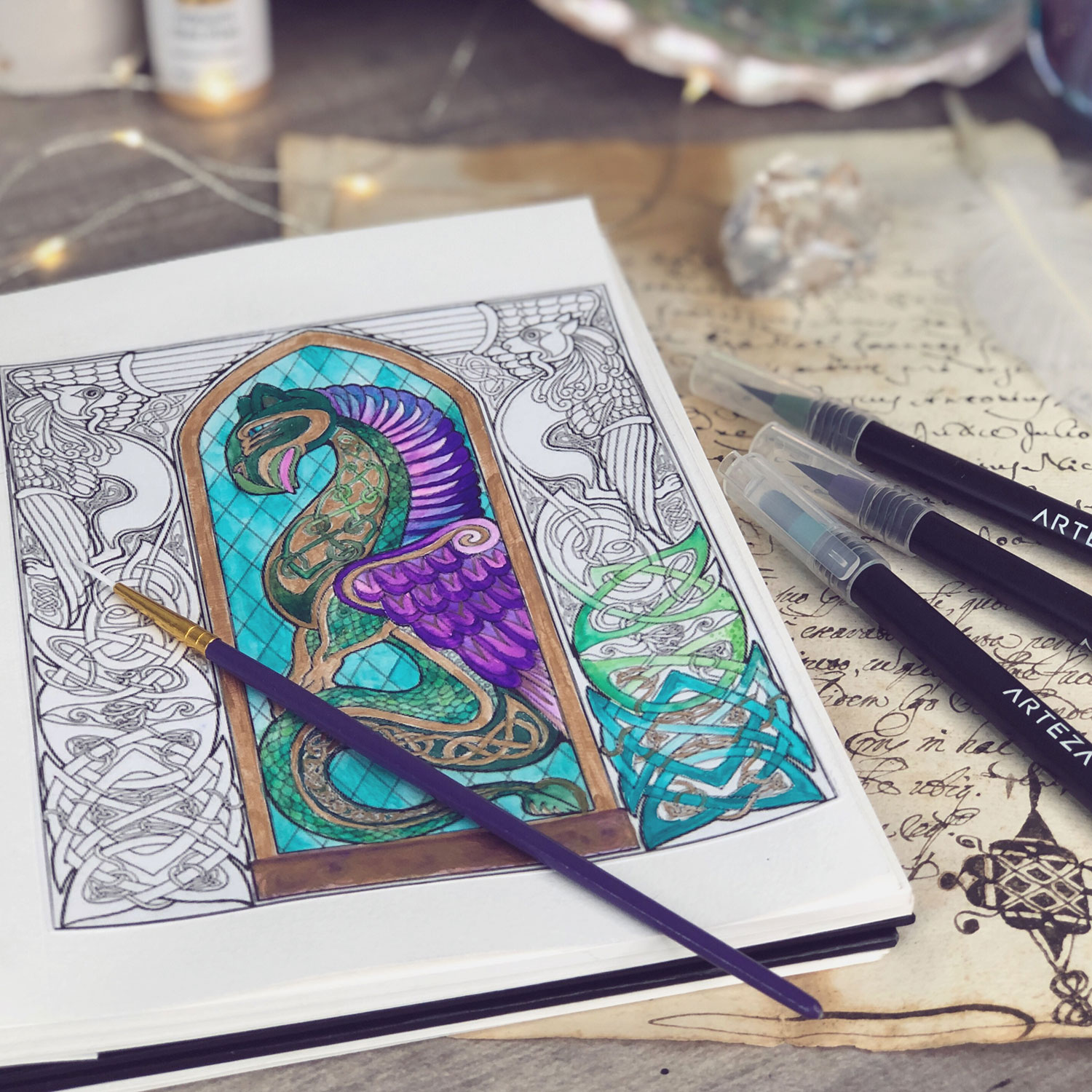 Celtic drawings and designs are so very beautiful and complex too! They are layered with symbol and meaning. Take a moment and look through our Celtic design files and print out a design that inspires you. Now, simply color it in! Yes, coloring recalls childhood memories of coloring books and crayons! Delightful right? But now, take your time and meditatively color your Celtic design. Imagine what it would have been like to hand draw and painstakingly paint these designs like the monks who created the Book of Kells. Enjoy the simple act of using color and playing with mediums without the additional task of drawing or composing. I loved using my Arteza Brush pens and gold paint to work on mine! Play music and daydream!