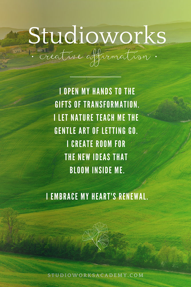 This could be a lake, river, stream, the ocean or even a pretty fountain. Go to this body of water on a regular basis and allow it to give you a sense of creative renewal and peace. Maybe take a small vial of it home with you and place it in your studio.