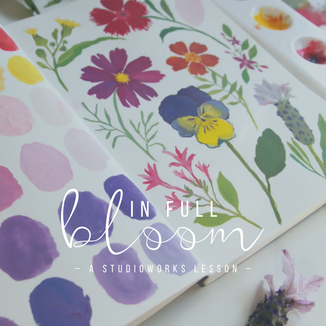Each month, we will highlight just one of these lessons as a sweet invitation for you to explore all that the Studioworks library has to offer. This month, along with our nature theme, we bring you a beautiful lesson from talented teacher, Deanna Marie from her class Inspired by Nature. This sweet lesson will have you out in your garden, mixing up colors and appreciating the Spring blooms that are popping up! Enjoy.