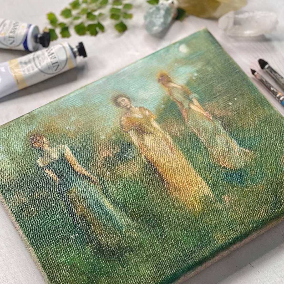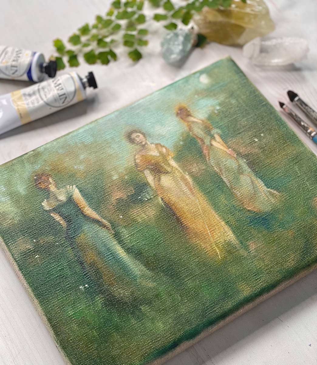 This month, I couldn’t help but be inspired by our master artist, Thomas Wilmer Dewing. His atmospheric paintings of figures in emerald landscapes have completely enchanted me. I love his blurred edges as though the female figures are one with the green land. That and the fact that we are approaching the Spring Equinox brought me to a verdant color palette. Rich greens of every kind are welcome. Golden edges and sparkling light speak to the pale sunlight through new leaves. New life abounds. I feel wrapped in these green and golden hues for a month of creative renewal.