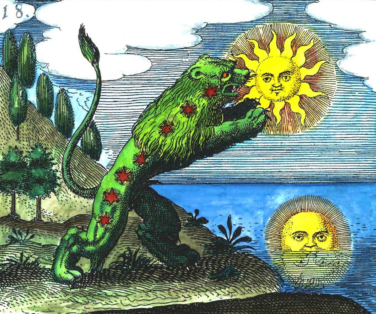 In Alchemy, solvents for gold were named “Green Lion” or “Green Dragon” by the alchemists. Such liquids were instrumental in the beginning of the alchemistic Opus Magnum. Transparent green crystal symbolized the “secret fire,” which represented the living spirit of substances.