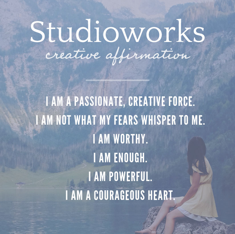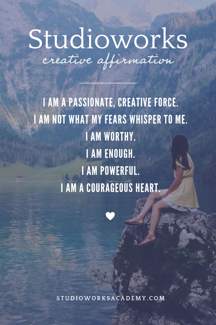 Each month we will have a positive affirmation. I recommend you print out this affirmation and put it in your sketchbook or somewhere in your studio. Recite the affirmation out loud each time you show up to create. Saying words aloud is powerful and can begin to re-write some of our own limiting beliefs or calm our fears. Try it now…
