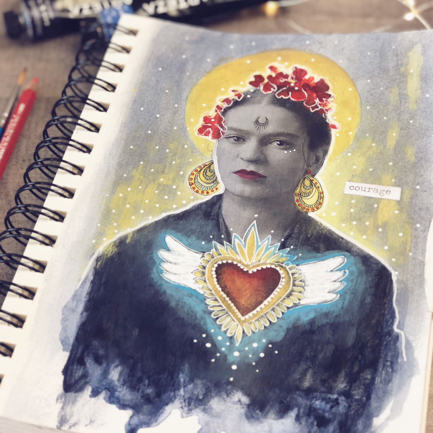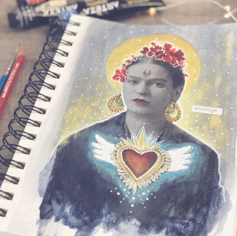 Use our master artist as inspiration and create a page dedicated to the wild and free Frida Kahlo. You could paint yourself with flowers in your hair and monkey’s around your neck or do a master study of her work! Anything that you feel aligns with your own courageous spirit with a dash of Frida flair!