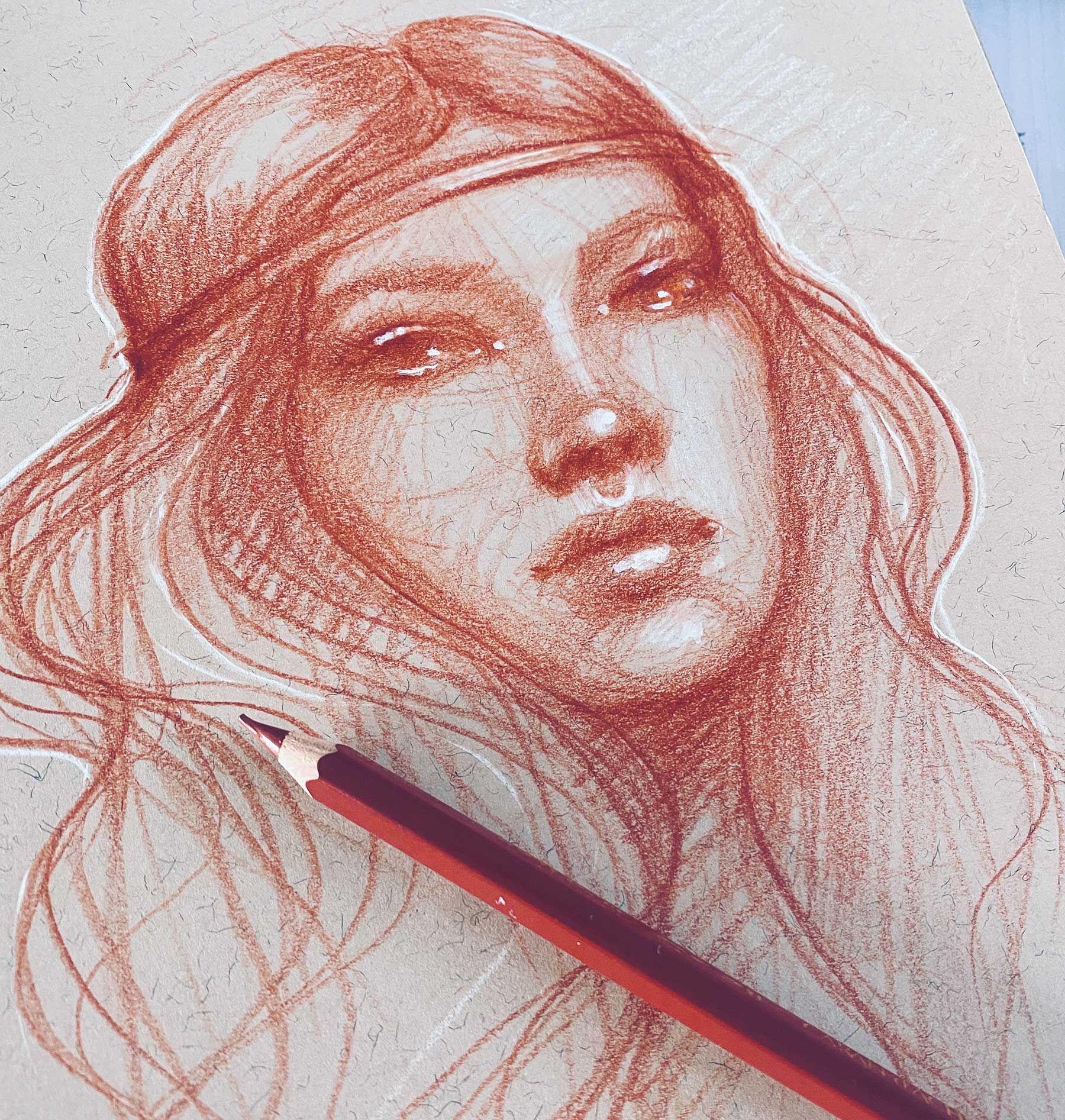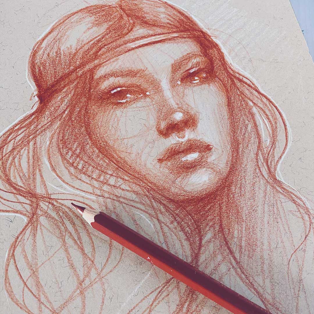 Have you ever seen the beautiful sketches done by the masters in a color called Sanguine? This gorgeous color is very similar to burnt sienna or russet and has such a wonderful earthiness. So why not practice our sketching in this gorgeous color or one similar. Don’t have a sanguine pencil? Try a dark brown, or a reddish chalk you can then add soft white highlights to really make the sketch spark! I used a toned paper sketchbook like this one and this pencil. I added highlights using a white charcoal pencil and my white posca pen.