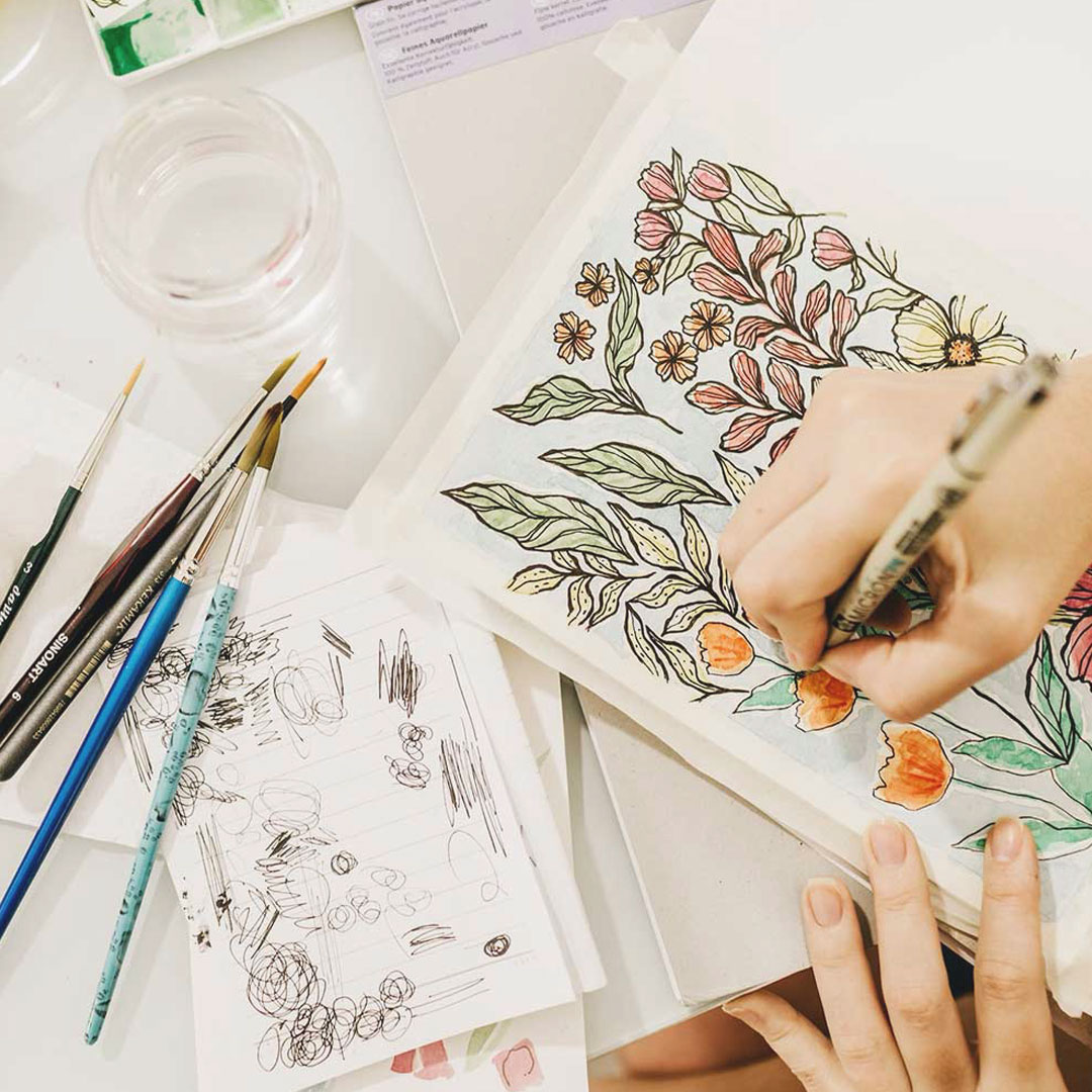 Dedicate a few pages in your sketchbook to explore what you create currently, what colors you use, what materials you employ and then see what happens when you add in new things. New subject matter, hues, mediums. How can you mix things up? Can you blend two styles you love? Or combine your materials in new ways? Pay attention to what excites you or even feels intimidating. This means you are pushing against your comfort zone. That’s a good thing!