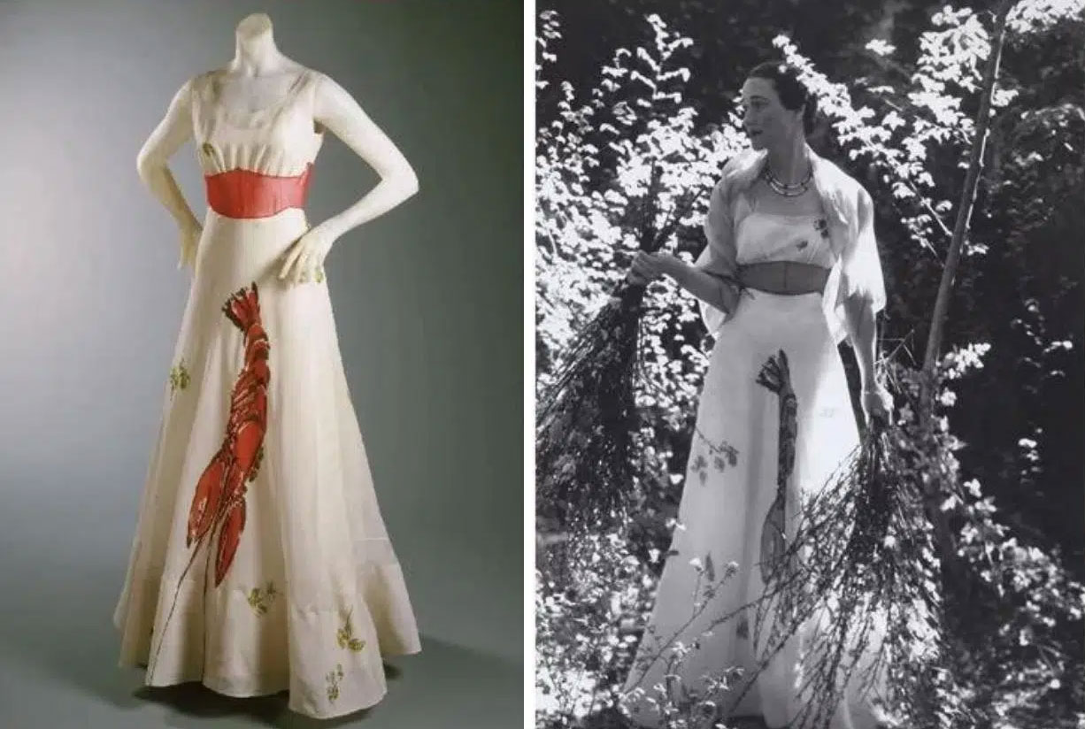 When the Duchess of Windsor, the sensual Wallis Simpson, donned a dress from the winter collection decorated with an enormous bright red lobster in an 8-page Vogue spread, the world took notice. Simpson, twice divorced, was engaged to Edward VIII, a union that met with profound public disapproval. Her wearing the lobster dress, rife with innuendos from its placement between the legs to the crustacean’s aphrodisiacal qualities, along with Dali’s belief in the lobster’s sexual symbolism, cemented Simpson as an object of scorn. This disdain only worsened when her husband chose to abdicate the British monarchy.