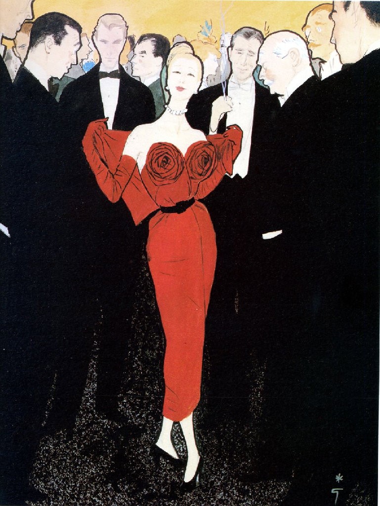 Rene Gruau's creative process and techniques varied depending on the project he was working on, but he was known for his ability to create bold, expressive illustrations that captured the essence of his subject matter. He often started with a rough sketch to establish the composition and basic shapes, and then built up the details and textures with layers of paint, ink, or other media. Gruau was a master of using negative space to create contrast and drama in his images, and he frequently incorporated calligraphic lines and bold, flat areas of color to create a graphic, almost poster-like quality to his illustrations. He was also skilled at conveying movement and energy in his work, whether depicting a flowing dress or a dancing figure.