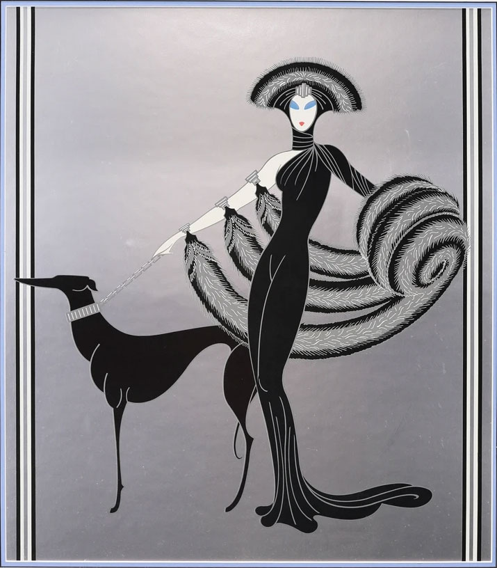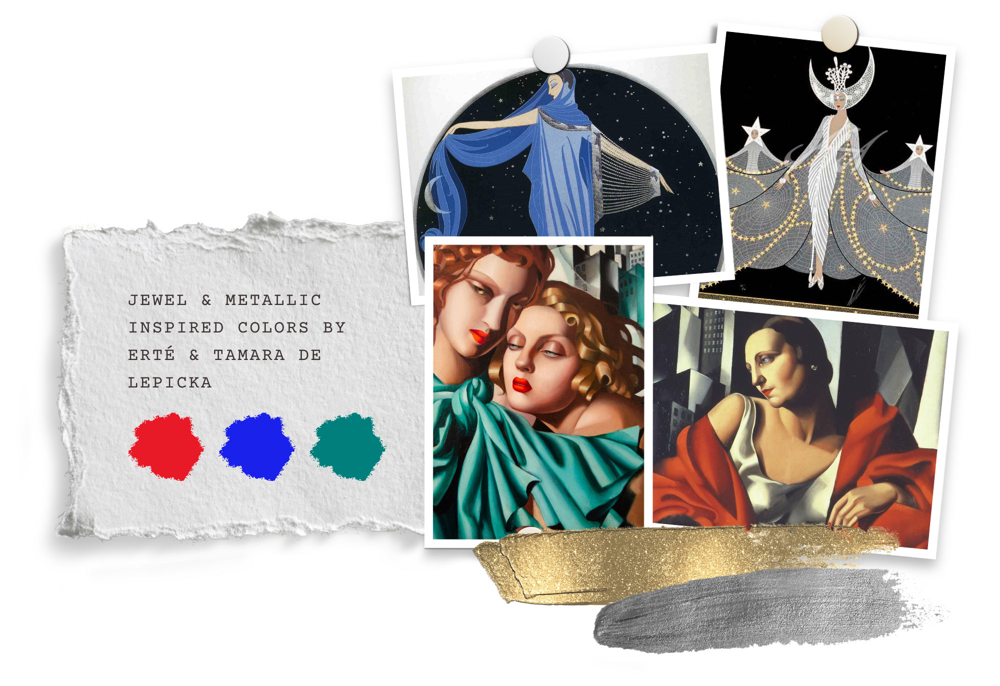 Both artists used accents of silver and gold in their work, alongside rich jewel tones. Think emerald, sapphire and ruby paired with shimmering metallics. Lempicka often balanced her bold color with cool muted grays, while Erté isolated his figures on ebony black backgrounds.