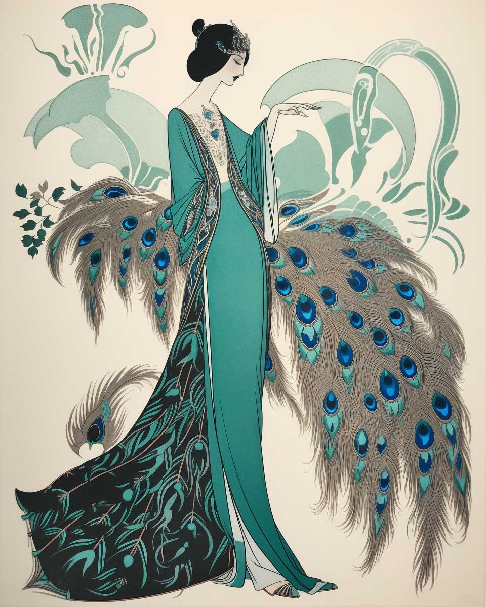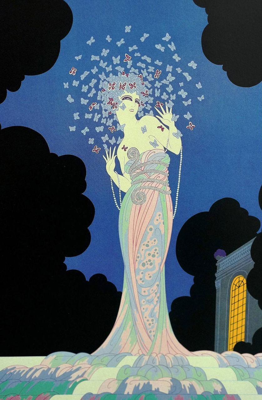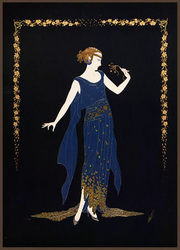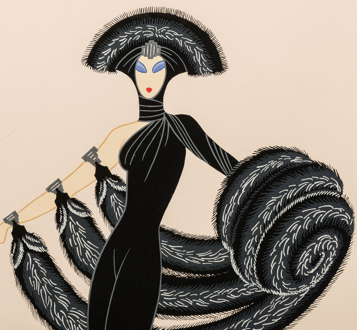 Erte's artwork was known for its elaborate and ornate style, often featuring women in intricate, fantastical costumes that were inspired by the exotic worlds of mythology and the stage. One of his most iconic works is "Symphony in Black," a series of illustrations featuring a woman in a sleek, black gown adorned with feathers and beads. The series captures the elegant, streamlined aesthetic of the Art Deco movement, and has become one of Erte's most famous and enduring works.