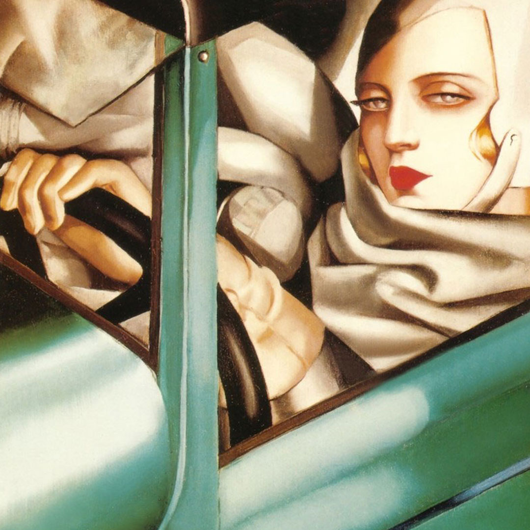 One of Lempicka's most famous works is her 1925 portrait "Tamara in a Green Bugatti," which depicts the artist in the driver's seat of a sleek green Bugatti car. The painting is a quintessential Art Deco image, with its sharp angles, bold colors, and sense of modernity and glamour.