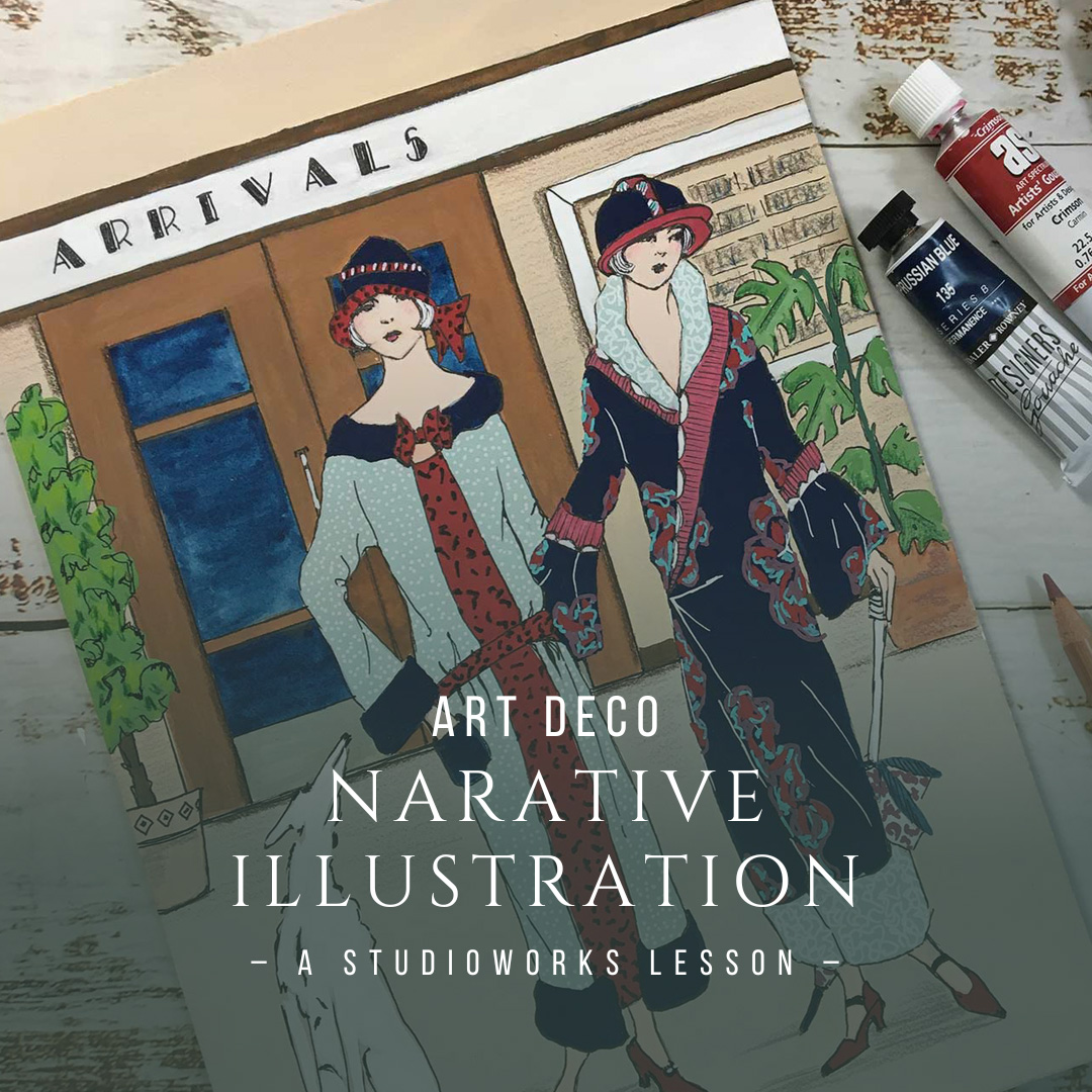 The fashion illustrators of the jazz age often placed their models in settings that not only showed off the clothing but conveyed a sense of story. We will put our learning around the fashion figure and illustrative techniques into practice and create a simple narrative piece. I invite you to draw from your own creative journey and environment to infuse personal meaning, yet at the same time entice the viewer to wonder about the mystery of the characters’ story.
