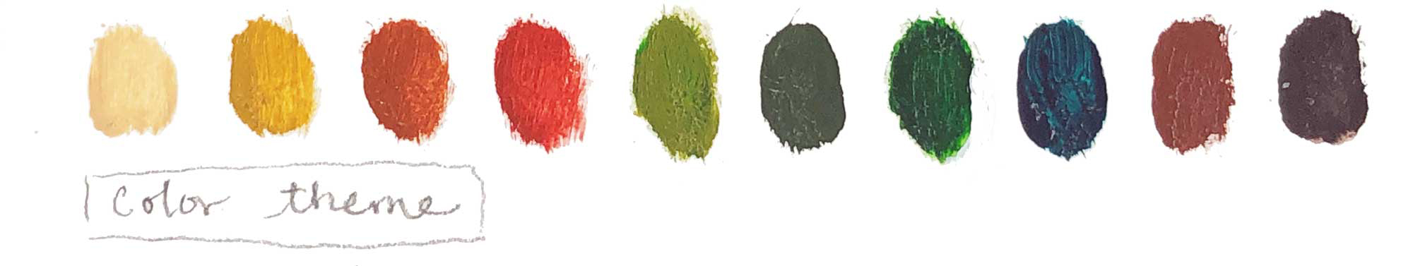 *Colors I used – Arteza acrylic paints – From left to right – Naples Yellow, Yellow Ochre, Mars Orange, Scarlet Red + Mars Orange, Olive Green, Prussian Green, Deep Green, Burnt Sienna, Raw Umber.