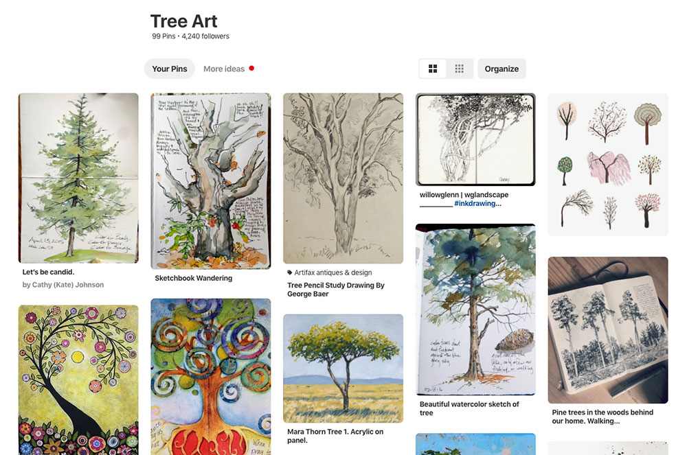 Choose a tree images or several that you are drawn to or choose to draw from life and sketch these trees. Even if you are working from an image, sit outside if you can and do this. Really tune into the tree, let your eyes trace its branches, imagine its roots beneath the earth. Spend this sacred time connecting with nature. Don’t worry about getting down every single branch or leaf…just try and focus on the main shapes. You can leave the tree as a sketch or feel free to add color in a medium you enjoy.