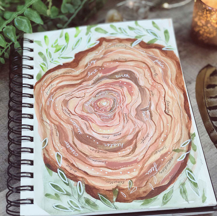 A tree’s age is measured by its growth ring, only visible when the tree is sliced in half. The heartwood is seen at the center and expands out into concentric circles. These rings belie not only the age of the tree but the story of its life, its wounds included. Our fingerprints bear an uncanny resemblance to these tree hearts. Using circular patterns create your own growth ring. Incorporate words, symbols or images that represent elements of yourself, your journey, your wounds and your growth. This can be very abstract or more literal, the meaning is for you alone.