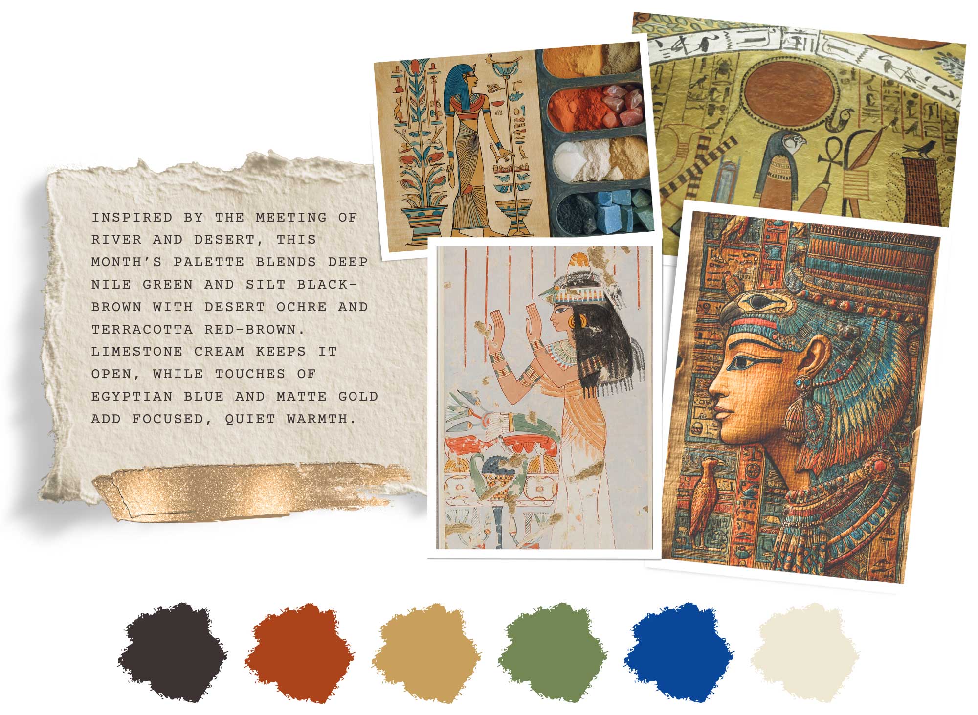 Deep Nile green brings grounded vitality. Silt black-brown adds depth and structure. Desert ochre introduces warmth and clarity. A terracotta red-brown, reminiscent of ancient plaster and iron-rich earth, adds human presence and warmth. Limestone cream keeps the palette open and breathable. Egyptian blue offers a focused, saturated accent. Matte antique gold provides a quiet, aged luminosity.