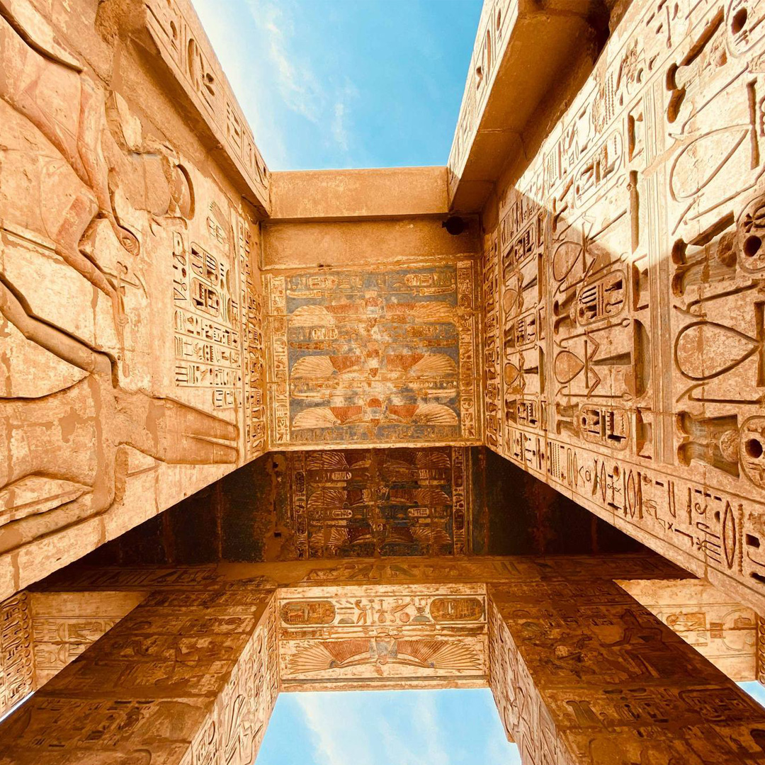 The famed Hathoric column capitals at Dendera are worth pausing over. Each one bears her serene frontal face, crowned with cow ears, repeated across the architecture with the quiet insistence of devotion rather than decoration. The face is stylized, symmetrical, utterly calm. Here, divine femininity is not symbolic. It is structural. She literally holds the temple up.