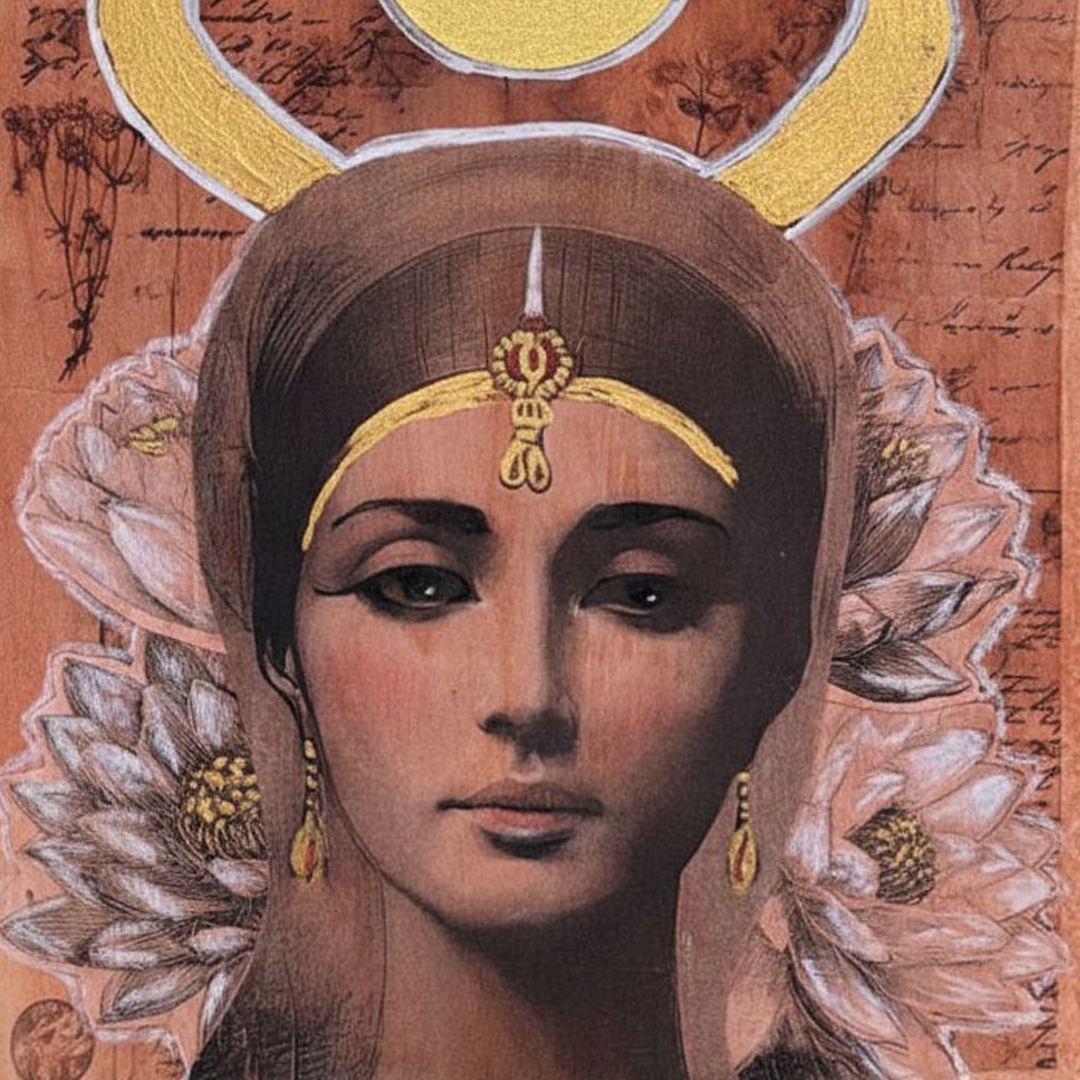 Layer slowly. Allow materials to overlap. Add painted linework or simple symbolic shapes: a crescent, wings, a lotus, a sun disk.