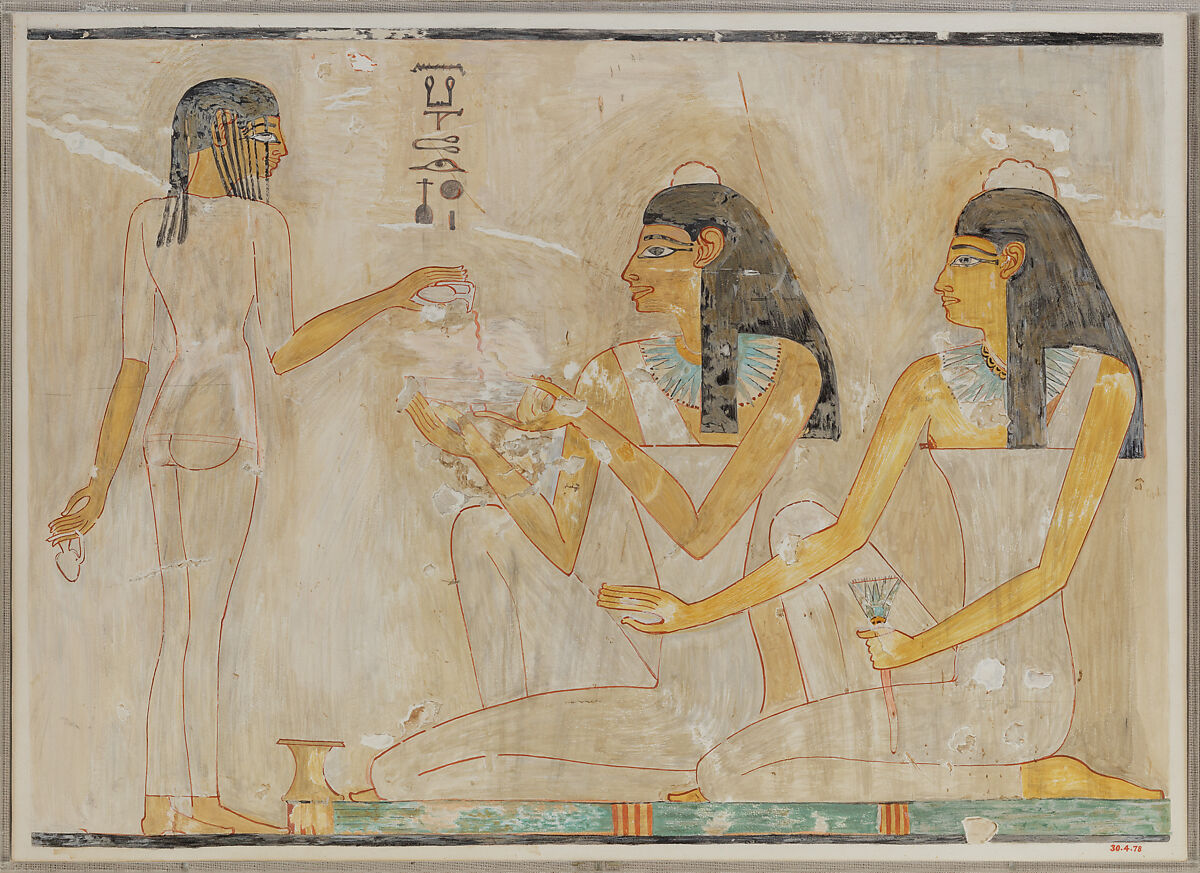Banquet scene eating and drinking beer from the tomb chapel of Nebamun, 14th century BC. Its imagery of music and dancing alludes to Hathor.