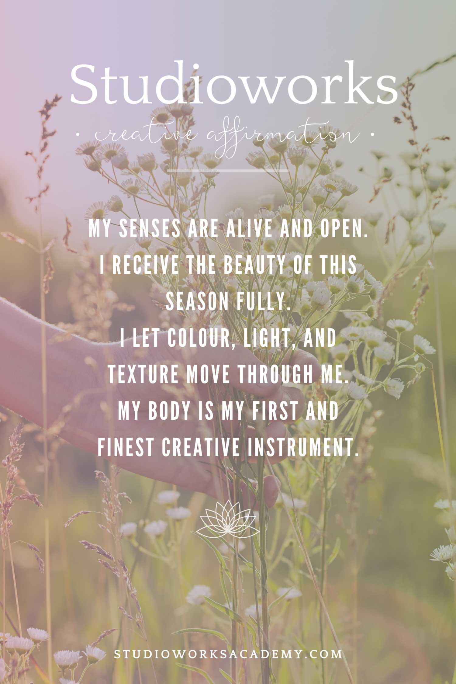 Each month we will have a positive affirmation. I recommend you print out this affirmation and put it in your sketchbook or somewhere in your studio. Recite the affirmation out loud each time you show up to create. Saying words aloud is powerful and can begin to re-write some of our own limiting beliefs or calm our fears. Try it now…
