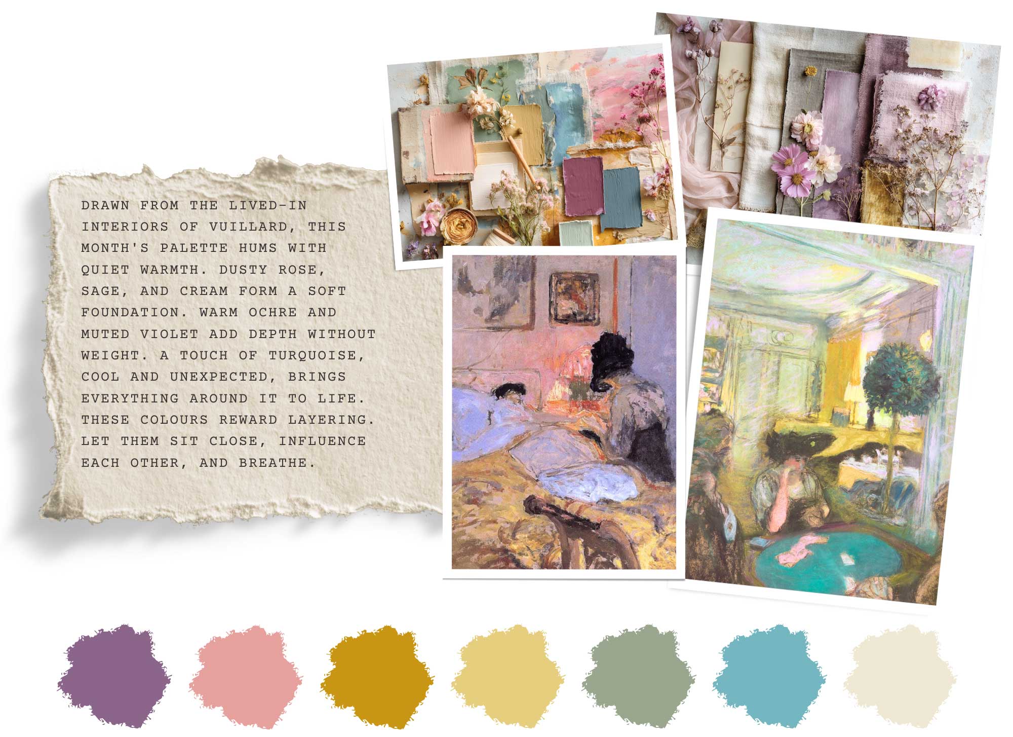 This month's palette is drawn directly from the world of Vuillard, the colors of lived-in French interiors in afternoon light. Nothing sharp, nothing demanding. These are colors that ask you to slow down and feel.