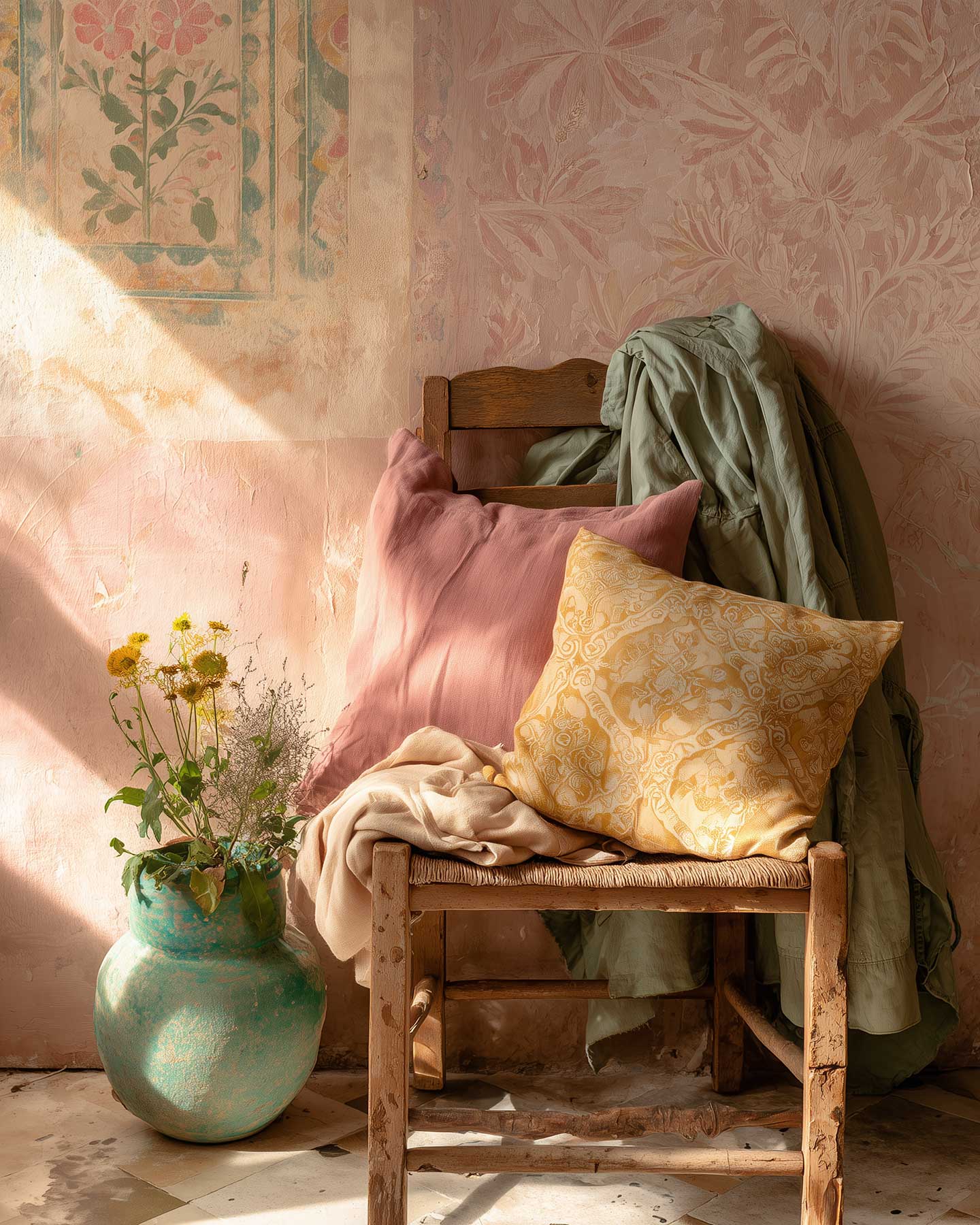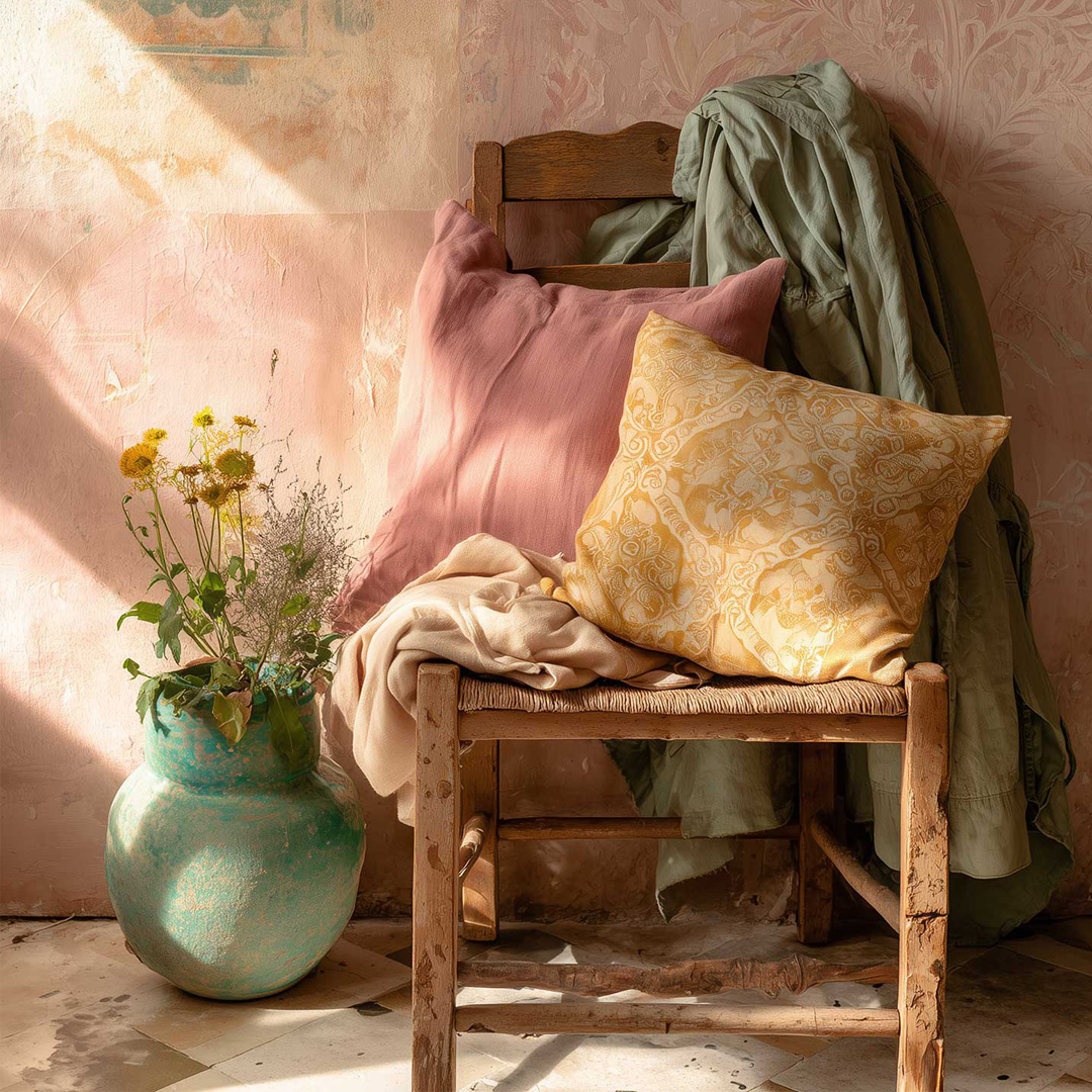 Dusty rose brings the warmth of faded fabric and old wallpaper. Sage green holds the quiet presence of a plant in a corner. Warm ochre is aged wood and afternoon sun falling sideways across a floor. Soft gold adds a gentle luminosity, not bright, not metallic, but the color of warmth itself. Muted violet offers depth without drama. Cream anchors everything and keeps the palette breathing. And then there is the turquoise. The glaze of a ceramic bowl, a tile glimpsed through a doorway. The one cool note that makes all the warmth around it feel more alive.